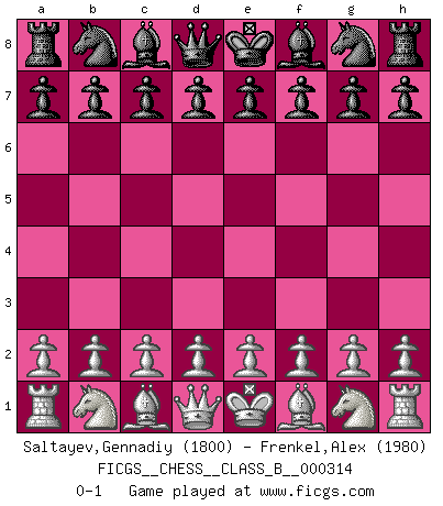 Last move : 0-1 2020 January 4 7:17:55 [Event "FICGS__CHESS__CLASS_B__000314"] [Site "FICGS"] [Date "2019.11.25"] [Round "1"] [White "Saltayev,Gennadiy"] [Black "Frenkel,Alex"] [Result "0-1"] [WhiteElo "1800"] [BlackElo "1980"] 0-1 This chess game has been lost on time (started : 2019.11.25 2:36:48) Player Black won this chess game. Follow this game move after move (download)For surely of all the drugs in the world, Chess must be the most permanently pleasurable. (Assiac) Die westlichen Werte sind eine Sprache, welche die Putin-Administration nicht versteht. (Garry Kasparov) El jugador táctico sabe que hacer cuando hay algo que hacer; mientras que el estratega sabe que hacer cuando no hay nada que hacer. (Gerald Abrahams) Les Echecs mettent en conflit, non pas deux intelligences, mais deux volontés. (Lasker) Computers are like Old Testament gods; lots of rules and no mercy. (Joseph Campbell)