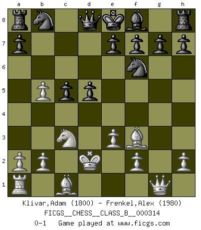 Last move : 0-1 2020 February 14 6:26:59 [Event "FICGS__CHESS__CLASS_B__000314"] [Site "FICGS"] [Date "2019.11.25"] [Round "1"] [White "Klivar,Adam"] [Black "Frenkel,Alex"] [Result "0-1"] [WhiteElo "1800"] [BlackElo "1980"] 1.d4 Nf6 2.c4 c5 3.d5 b5 4.e3 Bb7 5.cxb5 Bxd5 6.Nc3 Bb7 7.Be2 Bxg2 8.Nf3 Bxh1 9.Kd2 Bg2 10.Qg1 Bxf3 11.Bxf3 d5 0-1 This chess game has been lost on time (started : 2019.11.25 2:36:48) Comment by player 1 : Adam Klivar : I personally think it's a draw. I gave up the exchange pretty early in the game. He has a bad bishop, a bad knight and a rook that's currently attacked. I think we should just agree to a draw. Benko gambit Player Black won this chess game. Follow this game move after move (download)Blessed be the memory of him who gave the world this immortal game. (A. G. Gardiner) Die FIDE ist dabei in die Hände der russischen Mafia zu fallen. (Larry Evans) No es tiempo de jugar al Ajedrez cuando la casa esta en llamas. (Proverbio Italiano) Nous vivons dans un monde échiquéen : chaque jour qui passe est un défi à relever. (Philosophe Sasha) Wisdom begins at the end. (Daniel Webster)
