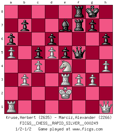 Last move : 1/2-1/2 2020 March 3 21:19:37 [Event "FICGS__CHESS__RAPID_SILVER__000249"] [Site "FICGS"] [Date "2019.11.27"] [Round "1"] [White "Kruse,Herbert"] [Black "Marciz,Alexander"] [Result "1/2-1/2"] [WhiteElo "2635"] [BlackElo "2266"] 1.Nf3 c5 2.e4 Nc6 3.Nc3 e5 4.Bc4 d6 5.d3 Be7 6.a4 Nf6 7.Bg5 O-O 8.Bxf6 Bxf6 9.Nd5 Be6 10.c3 Rc8 11.h4 Na5 12.Nd2 Nxc4 13.dxc4 Be7 14.Qe2 Qd7 15.b3 Bd8 16.f3 a6 17.Qd3 Rb8 18.a5 Bc7 19.Qc2 Ra8 20.Ke2 f5 21.exf5 Bxd5 22.cxd5 Rxf5 23.Ne4 Raf8 24.Kd1 Bd8 25.Qd3 Rh5 26.Ke2 h6 27.g3 Rhf5 28.Rhf1 Bc7 29.c4 R5f7 30.Kd2 Qd8 31.Qc3 Qd7 32.Ke2 Qc8 33.Rad1 Qf5 34.Qe1 Qd7 35.Rf2 Qc8 36.Qc3 Qf5 37.Qe1 Qc8 38.Qc3 Qf5 39.Rdf1 Qd7 40.Re1 Qf5 41.Kd1 Qd7 42.Re3 Qd8 43.Ra2 Qc8 44.Rd3 Qf5 45.Rh2 Qd7 46.Ke1 Qc8 47.Rf2 Qh3 48.Qd2 Kh7 49.Ke2 Kg8 50.Qe1 Kh8 51.Re3 Kh7 52.Rf1 Kh8 53.Qf2 Qd7 54.Ra1 Kg8 55.Qf1 Bd8 56.Qd1 Be7 57.Qh1 Qf5 58.Rf1 Bd8 59.Ra1 Be7 60.Rf1 Bd8 61.Ra1 Be7 1/2-1/2 Reti Opening Kingside Castling by player Black (move 7) This chess game ended in a draw. Follow this game move after move (download)My opponents make good moves too. Sometimes I don't take these things into consideration. (Bobby Fischer) In der Schule lernt man nichts. Es ist nur Zeitverschwendung. (Robert James Fischer) Estaba muy claro de que el punto vulnerable del Gran Maestro Americano (Bobby Fischer) radicaba en las posiciones de doble filo, colgantes, irracionales, donde el siempre falló en encontrar un triunfo aún en una posición de clara victoria. (Efim Geller) Pour se monter efficace, un Cavalier a besoin d'avant-postes ! Les Cavaliers font les meilleurs bloqueurs de pions passés. The large trees attract high winds. (Chinese proverb)