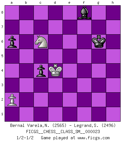 Last move : 1/2-1/2 2020 November 1 0:40:23 [Event "FICGS__CHESS__CLASS_SM__000023"] [Site "FICGS"] [Date "2019.11.29"] [Round "1"] [White "Bernal Varela,Nelson"] [Black "Legrand,Stephane"] [Result "1/2-1/2"] [WhiteElo "2565"] [BlackElo "2496"] 1.Nf3 Nf6 2.c4 g6 3.Nc3 d5 4.cxd5 Nxd5 5.h4 Bg7 6.e4 Nxc3 7.dxc3 Qxd1+ 8.Kxd1 Nd7 9.Nd4 e5 10.Nb5 Kd8 11.Be3 Nf6 12.f3 a6 13.Na3 Be6 14.Bc4 Ke7 15.Bc5+ Kd7 16.Ke2 Bxc4+ 17.Nxc4 Nh5 18.Kd2 Rad8 19.Kc2 Ke6 20.Be3 f5 21.exf5+ gxf5 22.g4 fxg4 23.fxg4 Nf6 24.Rag1 Rdf8 25.Rh2 b5 26.Na5 Nd5 27.Bc1 h5 28.Nb3 hxg4 29.Rxg4 Bf6 30.h5 Be7 31.h6 Bd6 32.Rg7 Nf4 33.h7 Rf7 34.Rh6+ Ke7 35.Rxf7+ Kxf7 36.Bxf4 exf4 37.Nd4 Bf8 38.Rh4 Bd6 39.Nf5 Bc5 40.b4 Bb6 41.Kd3 f3 42.Nd4 f2 43.Ke2 c5 44.bxc5 Bxc5 45.Kxf2 Be7 46.Rh3 Kg6 47.Ke3 Rxh7 48.Rxh7 Kxh7 49.Nc6 Bf8 50.c4 bxc4 51.Kd4 Kg6 1/2-1/2 Reti Opening 10 pieces endgame at move 47 : White KRNPP , Black KRBPP WHITE : King + 1 Rook 1 Knight 2 Pawns BLACK : King + 1 Rook 1 Bishop 2 Pawns 9 pieces endgame at move 48 : White KRNPP , Black KBPP WHITE : King + 1 Rook 1 Knight 2 Pawns BLACK : King + 1 Bishop 2 Pawns 8 pieces endgame at move 48 : White KNPP , Black KBPP WHITE : King + 1 Knight 2 Pawns BLACK : King + 1 Bishop 2 Pawns 7 pieces endgame at move 50 : White KNP , Black KBPP WHITE : King + 1 Knight 1 Pawn BLACK : King + 1 Bishop 2 Pawns This chess game ended in a draw. Follow this game move after move (download)My style is somewhere between that of Tal and Petrosian. (Reshevsky) Ein Teil des Fehlers ist immer korrekt. (Savielly Grigorievitsch Tartakower) Yo no creo en la psicología. Yo creo en las buenas movidas. (Bobby Fischer) Karpov est une pièce de musée. (Garry Kasparov) Patience, use the Force, think ! (Obi-Wan Kenobi in Star Wars ep.2)