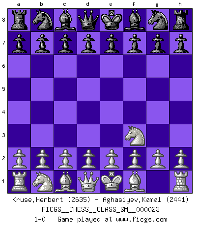 Last move : 1-0 2020 January 8 15:1:18 [Event "FICGS__CHESS__CLASS_SM__000023"] [Site "FICGS"] [Date "2019.11.29"] [Round "1"] [White "Kruse,Herbert"] [Black "Aghasiyev,Kamal"] [Result "1-0"] [WhiteElo "2635"] [BlackElo "2441"] 1.Nf3 1-0 This chess game has been lost on time (started : 2019.11.29 8:30:29) Reti Opening Player White won this chess game. Follow this game move after move (download)When I asked Fischer why he had not played a certain move in our game, he replied: 'Well, you laughed when I wrote it down !' (Mikhail Tal) Alles was ich jemals tun will ist Schach spielen. (Robert James Fischer) Las ideas audaces son como las piezas del Ajedrez que avanzan hacia adelante. Ellas pueden ser vencidas, pero también pueden iniciar una partida victoriosa. (Goethe) L'action d'une oeuvre littéraire se déroule sur un champ de bataille. Les masques et les types du drame moderne correspondent aux pièces du jeu d'échecs. L'intrigue correspond aux coups et aux gambits, c'est à dire aux techniques du jeu telles qu'utilisées et interprétées par les joueurs. Les tactiques et les péripéties [mouvements] correspondent aux coups exécutés par l'adversaire. (Viktor Shklovsky) Programmer - an organism that turns coffee into software. (Anonymous)