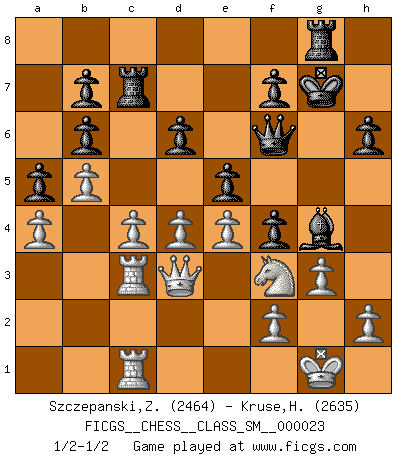 Last move : 1/2-1/2 2020 April 9 9:44:34 [Event "FICGS__CHESS__CLASS_SM__000023"] [Site "FICGS"] [Date "2019.11.29"] [Round "1"] [White "Szczepanski,Zbigniew"] [Black "Kruse,Herbert"] [Result "1/2-1/2"] [WhiteElo "2464"] [BlackElo "2635"] 1.e4 e5 2.Nf3 Nc6 3.Bb5 Nf6 4.d3 Bc5 5.Ba4 O-O 6.O-O d6 7.c3 Bd7 8.Bg5 h6 9.Bh4 g5 10.Bg3 Nh5 11.b4 Bb6 12.Nbd2 Qf6 13.Bxc6 Bxc6 14.Nc4 Nf4 15.a4 a6 16.Re1 Kh7 17.Rc1 Rg8 18.Nxb6 cxb6 19.c4 a5 20.b5 Bd7 21.d4 Bg4 22.Kh1 Rad8 23.Bxf4 gxf4 24.Qd3 Qg6 25.Nh4 Qg5 26.g3 Rde8 27.Rc3 Qf6 28.Nf3 Rc8 29.Rec1 Rc7 30.Kg1 Kg7 1/2-1/2 Ruy Lopez : Berlin defense Kingside Castling by player Black (move 5) Kingside Castling by player White (move 6) This chess game ended in a draw. Follow this game move after move (download)Though most people love to look at the games of the great attacking masters, some of the most successful players in history have been the quiet positional players. They slowly grind you down by taking away your space, tying up your pieces, and leaving you with virtually nothing to do ! (Yasser Seirawan) Spiel ein langweiliges Spiel zu Ende und lustige Dinge können passieren. (Hans Ree) Si yo gano un torneo, yo lo gano por mí mismo. Yo hago las jugadas. Nadie me ayuda. (Bobby Fischer) Que feriez-vous si vous étiez en train de jouer aux échecs et que la fin du monde arrive ? Je continuerais à jouer. (Saint Borromée) To steal ideas from one person is plagiarism. To steal from many is research. (Unknown)