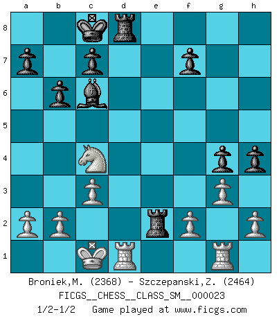 Last move : 1/2-1/2 2020 January 10 20:11:24 [Event "FICGS__CHESS__CLASS_SM__000023"] [Site "FICGS"] [Date "2019.11.29"] [Round "1"] [White "Broniek,Mariusz Maciej"] [Black "Szczepanski,Zbigniew"] [Result "1/2-1/2"] [WhiteElo "2368"] [BlackElo "2464"] 1.d4 Nf6 2.Nf3 b6 3.Bg5 Bb7 4.e3 e6 5.Nbd2 Be7 6.Bd3 h6 7.Bh4 g5 8.Bg3 g4 9.Ne5 h5 10.e4 d6 11.Nec4 h4 12.Bf4 d5 13.exd5 Qxd5 14.c3 Nc6 15.Rg1 O-O-O 16.Be5 Rhg8 17.Bxf6 Bxf6 18.Qe2 Bg5 19.Be4 Bxd2+ 20.Nxd2 Qg5 21.O-O-O e5 22.Bxc6 Bxc6 23.Qxe5 Qxe5 24.dxe5 Rg5 25.g3 Rxe5 26.Nc4 Re2 1/2-1/2 Queen's Indian defense Queenside Castling by player Black (move 15) Queenside Castling by player White (move 21) This chess game ended in a draw. Follow this game move after move (download)In complicated positions, Bobby Fischer hardly had to be afraid of anybody. (Paul Keres) Wenn du auf das Glück wartest, wird das Leben ziemlich langweilig. (Mikhail Nekhemyevich Tal) Los finales de Peón son del Ajedrez lo que el cesped es del Golf. (Cecil Purdy) Demandez au pauvre Cg1 ce qu'il en pense. Eduard Gufeld à propos de la variante Saemisch de l'Est-Indienne. Chess, like love, like music, has the power to make people happy. (Siegbert Tarrasch)
