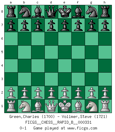 Last move : 0-1 2020 January 1 1:48:28 [Event "FICGS__CHESS__RAPID_B__000331"] [Site "FICGS"] [Date "2019.12.01"] [Round "1"] [White "Green,Charles"] [Black "Vollmer,Steve"] [Result "0-1"] [WhiteElo "1700"] [BlackElo "1721"] 0-1 This chess game has been lost on time (started : 2019.12.01 13:49:53) Player Black won this chess game. Follow this game move after move (download)Chess is no whit inferior to the violin, and we have a large number of professional violinists. (Mikhail Botvinnik) Das Schachspiel übertrifft alle anderen Spiele so weit wie der Chimborasso einen Misthaufen. (Arthur Schopenhauer) La táctica fluye a partir de una posición superior. (Bobby Fischer) Les Echecs ont trois composantes : le temps, l'espace et le matériel en dernier. (Mikhail Tal) There's always a bigger fish. (Qui-Gon Jinn in Star Wars ep.1)