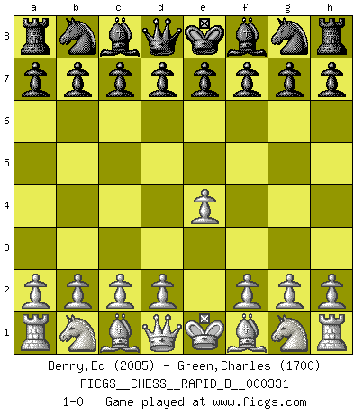Last move : 1-0 2020 January 1 1:48:28 [Event "FICGS__CHESS__RAPID_B__000331"] [Site "FICGS"] [Date "2019.12.01"] [Round "1"] [White "Berry,Ed"] [Black "Green,Charles"] [Result "1-0"] [WhiteElo "2085"] [BlackElo "1700"] 1.e4 1-0 This chess game has been lost on time (started : 2019.12.01 13:49:53) King's pawn Opening Player White won this chess game. Follow this game move after move (download)On the chessboard, lies and hypocrisy do not survive long. (Emanuel Lasker) Wer mein Gambit spielt, muß bereit sein, alle Brücken hinter sich abzubrechen. Es verändert den ganzen Menschen. Es wirkt wie ein Zauberstab und fördert verkümmerte, gute Charakter- eigenschaften wieder zu Tage. (Emil Joseph Diemer) Realmente no sabemos como el juego fue inventado, aunque hay sospechas. Tan pronto como descubramos a los culpables, se los haremos saber. (Bruce Pandolfini) Toute estimation doit être constamment réévaluée. (Jacob Estrin) All the biggest technological inventions created by man - the airplane, the automobile, the computer - says little about his intelligence, but speaks volumes about his laziness. (Mark Kennedy)