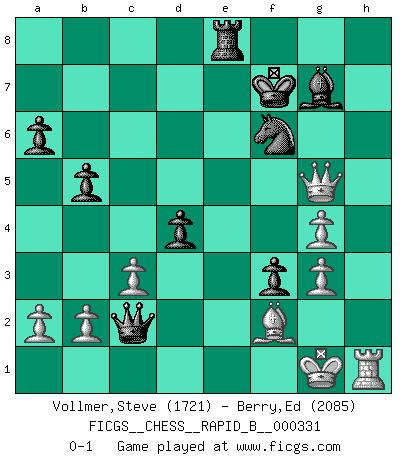 Last move : 0-1 2019 December 14 20:9:28 [Event "FICGS__CHESS__RAPID_B__000331"] [Site "FICGS"] [Date "2019.12.01"] [Round "1"] [White "Vollmer,Steve"] [Black "Berry,Ed"] [Result "0-1"] [WhiteElo "1721"] [BlackElo "2085"] 1.e4 c5 2.Nf3 d6 3.d4 cxd4 4.Nxd4 Nf6 5.Nc3 a6 6.Be2 g6 7.Be3 e5 8.Nb3 Be6 9.f3 Nbd7 10.Qd2 b5 11.O-O Qc7 12.Nd1 d5 13.exd5 Nxd5 14.Bf2 N7b6 15.Ne3 Nf4 16.Rfd1 Be7 17.Bf1 O-O 18.g3 Rfd8 19.Qe1 Nh3+ 20.Bxh3 Bxh3 21.Qe2 Be6 22.Kg2 Re8 23.Rac1 Rac8 24.c3 Qb7 25.h4 Bf8 26.h5 f5 27.hxg6 hxg6 28.Rh1 Nd7 29.Rh4 Nf6 30.Rch1 Bg7 31.Kg1 g5 32.R4h3 f4 33.Ng4 Bxg4 34.fxg4 f3 35.Qe3 Qd5 36.Qxg5 Qd1+ 37.Kh2 Qc2 38.Kg1 Rcd8 39.Nd4 exd4 40.Rh8+ Kf7 41.Rxe8 Rxe8 0-1 Sicilian : Najdorf, Opovcensky variation Kingside Castling by player White (move 11) Kingside Castling by player Black (move 17) Player Black won this chess game. Follow this game move after move (download)Who is your opponent tonight, tonight I am playing against the Black pieces. (Akiba Rubinstein) Der Partner hat auch seine Existenzberechtigung. (Savielly Grigorievitsch Tartakower) El Ajedrez expande y enriquece tu mente. (Saudin Robovic) La vie est comme un jeu d'échecs : nous esquissons un plan, mais celui-ci est tributaire de ce que daignent faire l'adversaire aux échecs et le destin dans la vie. (Arthur Schopenhauer) Control your own destiny or someone else will. (Jack Welch)