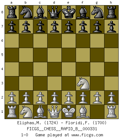 Last move : 1-0 2020 January 1 13:52:35 [Event "FICGS__CHESS__RAPID_B__000331"] [Site "FICGS"] [Date "2019.12.01"] [Round "1"] [White "Eliphas,Matthew"] [Black "Floridi,Fabrizio"] [Result "1-0"] [WhiteElo "1724"] [BlackElo "1700"] 1.Nf3 1-0 This chess game has been lost on time (started : 2019.12.01 13:49:53) Reti Opening Player White won this chess game. Follow this game move after move (download)Chess is a terrible game. If you have no center, your opponent has a freer position. If you do have a center, then you really have something to worry about ! (Siegbert Tarrasch) Rubinstein ist ein Turmendspiel, welches die Götter vor tausenden von Jahren begannen. (Savielly Grigorievitsch Tartakower) El Ajedrez es el juego mas altamente simbólico, pero las agresiones estan por lo tanto aún mas francamente representadas en la partida. Tal vez comenzo como un juego de guerra; Algo como la representación de una batalla en miniatura entre las fuerzas de dos reinos. (Karl Meninger) Vous n'êtes pas toujours obligé de jouer le meilleur coup. Un coup doit être actif, entreprenant, correct et beau ! (David Bronstein) If you know the enemy and know yourself you need not fear the results of a hundred battles. (Sun Tzu)