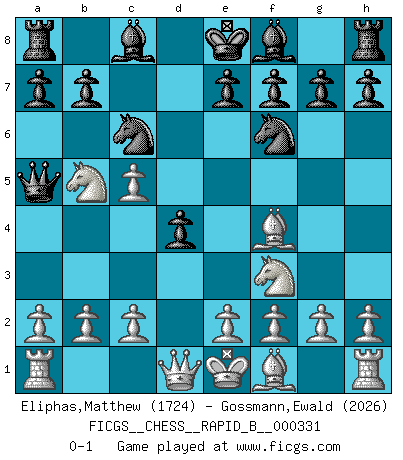 Last move : 0-1 2019 December 11 0:42:55 [Event "FICGS__CHESS__RAPID_B__000331"] [Site "FICGS"] [Date "2019.12.01"] [Round "1"] [White "Eliphas,Matthew"] [Black "Gossmann,Ewald"] [Result "0-1"] [WhiteElo "1724"] [BlackElo "2026"] 1.Nf3 d5 2.d4 Nf6 3.Nc3 c5 4.dxc5 Nc6 5.Bf4 d4 6.Nb5 Qa5+ 0-1 Reti Opening Player Black won this chess game. Follow this game move after move (download)When you see a good move, look for a better one. (Emanuel Lasker) Schach ist das schnellste Spiel der Welt, weil man in jeder Sekunde Tausende von Gedanken ordnen muß. (Albert Einstein) El Ajedrez se juega con la mente... ¡no con las manos!. (Renaud y Kahn) La vie et les Echecs sont tous les deux une lutte constante. (Lasker) You can think I'm wrong, but that's no reason to quit thinking. (Gregory House, House M.D.)