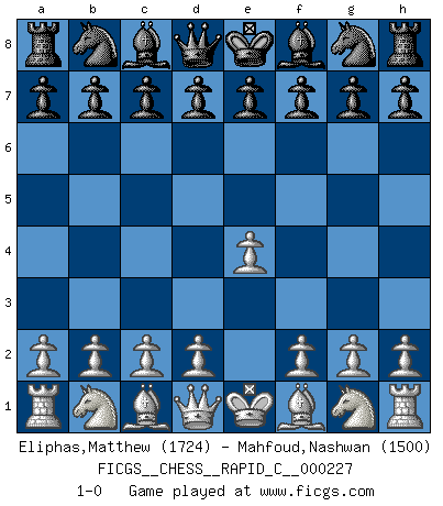 Last move : 1-0 2020 January 3 5:59:27 [Event "FICGS__CHESS__RAPID_C__000227"] [Site "FICGS"] [Date "2019.12.03"] [Round "1"] [White "Eliphas,Matthew"] [Black "Mahfoud,Nashwan"] [Result "1-0"] [WhiteElo "1724"] [BlackElo "1500"] 1.e4 1-0 This chess game has been lost on time (started : 2019.12.03 17:49:23) King's pawn Opening Player White won this chess game. Follow this game move after move (download)There are tough players and nice guys, and I'm a tough player. (Bobby Fischer) Jeder leidlich begabte Spieler, er braucht keineswegs hervorragend veranlagt zu sein, kann es zum Meister bringen. Aber das ist ja auch gar nicht nötig! Der richtige Standpunkt ist es, zu seinem Vergnügen zu spielen, und man glaube ja nicht, dass der Genuss proportional dem Können sei. (Siegbert Tarrasch) El Ajedrez era la lengua materna de Capablanca. (Reti) Les échecs, c'est l'imagination. (David Bronstein) Computer Science is no more about computers than astronomy is about telescopes. (Edsger W. Dijkstra)