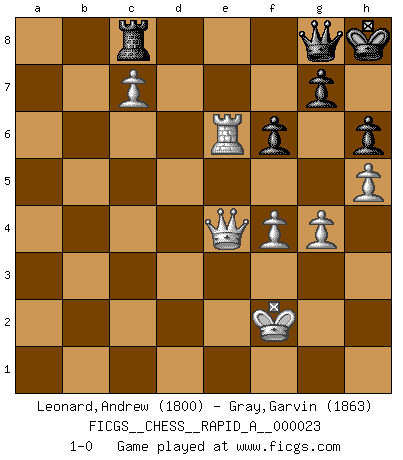 Last move : 1-0 2008 January 17 6:32:27 [Event "FICGS__CHESS__RAPID_A__000023"] [Site "FICGS"] [Date "2007.06.30"] [Round "1"] [White "Leonard,Andrew"] [Black "Gray,Garvin"] [Result "1-0"] [WhiteElo "1800"] [BlackElo "1863"] 1.e4 e5 2.Nf3 Nc6 3.Nc3 Nf6 4.d4 exd4 5.Nxd4 Bb4 6.Nxc6 bxc6 7.Bd3 d5 8.exd5 cxd5 9.O-O O-O 10.a3 Bd6 11.Nb5 Ba6 12.Nxd6 Qxd6 13.Bxa6 Qxa6 14.b4 Rfe8 15.Bb2 Ne4 16.Qxd5 Rad8 17.Qf5 f6 18.Rfe1 Qc4 19.Rac1 Rd2 20.Bc3 R2d8 21.Ba1 a6 22.Qf3 Kf8 23.Qe2 Nd2 24.Qd1 Rxe1+ 25.Qxe1 Qc6 26.Qe2 Nc4 27.h4 Nxa3 28.c4 Qd7 29.Qa2 Qa4 30.Bb2 Rd3 31.Ra1 c5 32.Bxa3 cxb4 33.Bxb4+ Qxb4 34.Qxa6 Rd8 35.g3 Qc3 36.Kg2 Qe5 37.Ra2 Qe4+ 38.f3 Qd4 39.Qa3+ Kf7 40.Qb3 Kg6 41.Qb5 Qd3 42.g4 h6 43.Qa4 Rc8 44.h5+ Kf7 45.Qb4 Qd7 46.Rd2 Qe7 47.Qa4 Kf8 48.Qc2 Qe1 49.c5 Qe6 50.Qh7 Qc6 51.Qf5 Qe8 52.Ra2 Kg8 53.Rc2 Kf8 54.Qd5 Rd8 55.Qb3 Rb8 56.Qc4 Rc8 57.c6 Rc7 58.Kh3 Qe3 59.Qd5 Qe8 60.Rc4 Rc8 61.c7 Qe7 62.Qb7 Qd7 63.Rc2 Ke7 64.Kg3 Qd6+ 65.Kg2 Qd7 66.Qb4+ Kf7 67.Qb3+ Ke7 68.Re2+ Kf8 69.Qb4+ Kf7 70.Qc4+ Kf8 71.Qc5+ Kf7 72.Rc2 Kg8 73.Qc6 Qe7 74.f4 Kf8 75.Kf3 Kg8 76.Rc3 Kh8 77.Kf2 Kh7 78.Rc1 Kg8 79.Re1 Qf7 80.Re2 Kh8 81.Re6 Qg8 82.Qe4 1-0 Four knights : Scotch, 4...exd4 Kingside Castling by player White (move 9) Kingside Castling by player Black (move 9) Player White won this chess game. Follow this game move after move (download)If a ruler does not understand Chess, how can he rule over a kingdom ? (King Khusros II) Pläne sind die Träume des Verständigen. (Ernst Freiherr von Feuchtersleben) Todavía soy una víctima del Ajedrez. Tiene toda la belleza del arte y mucho mas. No puede ser comercializado. El Ajedrez es mas puro que el arte en su posición social. (Marcel Duchamp) D'abord les bases : Jouez et étudiez, puis étudiez et jouez, ensuite jouez et étudiez, puis étudiez et jouez. Deuxièmement : Donnez toujours le meilleur de vous-même ! (Ken Smith) The existence of forgetting has never been proved: We only know that some things don't come to mind when we want them. (Friedrich Nietzsche)