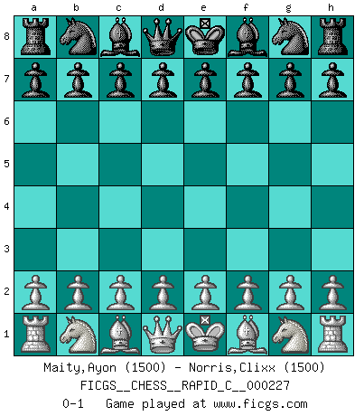 Last move : 0-1 2020 January 3 5:59:27 [Event "FICGS__CHESS__RAPID_C__000227"] [Site "FICGS"] [Date "2019.12.03"] [Round "1"] [White "Maity,Ayon"] [Black "Norris,Clixx"] [Result "0-1"] [WhiteElo "1500"] [BlackElo "1500"] 0-1 This chess game has been lost on time (started : 2019.12.03 17:49:23) Player Black won this chess game. Follow this game move after move (download)Without error there can be no brilliancy. (Emanuel Lasker) Ich hatte Angst gegen einen russischen Großmeister zu verlieren, und er befürchtete gegen einen kleinen Jungen zu verlieren. (über ein Remis gegen Juri Awerbach). (Robert James Fischer) El Ajedrez es realmente noventa y nueve por ciento calculación. (Soltis) Des combinaisons [dans le jeu d'échecs] pareilles à des mélodies. Je crois entendre pour ainsi dire la musique des coups... (Vladimir Nabokov) Industry executives and analysts often mistakenly talk about strategy as if it were some kind of chess match. But in chess, you have just two opponents, each with identical resources, and with luck playing a minimal role. The real world is much more like a poker game, with multiple players trying to make the best of whatever hand fortune has dealt them. In our industry, Bill Gates owns the table until someone proves otherwise. (David Moschella, 'Computerworld')