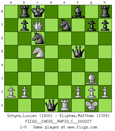 Last move : 1-0 2019 December 23 14:38:21 [Event "FICGS__CHESS__RAPID_C__000227"] [Site "FICGS"] [Date "2019.12.03"] [Round "1"] [White "Schyns,Lucien"] [Black "Eliphas,Matthew"] [Result "1-0"] [WhiteElo "1500"] [BlackElo "1724"] 1.e4 e6 2.d4 d5 3.Nc3 c5 4.Nf3 Nc6 5.Bb5 Bd7 6.exd5 exd5 7.Nxd5 cxd4 8.Qe2+ Be6 9.Nf4 Qd6 10.O-O Nge7 11.Ng5 a6 12.Nfxe6 axb5 13.Re1 fxe6 14.Nxe6 Kd7 15.Qxb5 Rb8 16.Bf4 Qd5 17.Nc5+ Kc8 18.c4 dxc3 19.Rad1 Qf5 20.Bg3 c2 21.Qb6 cxd1Q 22.Qc7+ 1-0 French : Marshall variation Kingside Castling by player White (move 10) Promotion Queen by player Black (move 21) Player White won this chess game. Follow this game move after move (download)A thorough understanding of the typical mating continuations makes the most complicated sacrificial combinations leading up to them not only not difficult, but almost a matter of course. (Siegbert Tarrasch) Ich würde mich als ganz normalen Jungen bezeichnen [Im Alter von 12]. (Sergej Karjakin) Cuando tengas duda... ¡juega al Ajedrez!. (Tevis) Lorsque vous vous retrouvez devant une position atroce, ne tendez pas un ultime piège dérisoire avec l'intention d'abandonner si l'adversaire le déjoue ! Faites-vous plutôt un devoir de résister comme si votre vie en dépendait. Jouez le coup qui vous déplairait au centuple si vous étiez dans la peau de votre tortionnaire ! Patience, use the Force, think ! (Obi-Wan Kenobi in Star Wars ep.2)