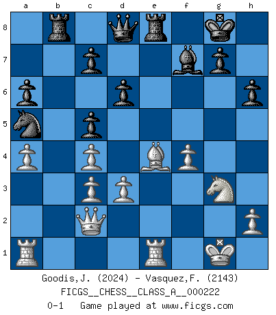 Last move : 0-1 2020 July 2 13:14:27 [Event "FICGS__CHESS__CLASS_A__000222"] [Site "FICGS"] [Date "2019.12.04"] [Round "1"] [White "Goodis,Johannes"] [Black "Vasquez,Fernando"] [Result "0-1"] [WhiteElo "2024"] [BlackElo "2143"] 1.c4 e5 2.Nc3 Nc6 3.Nf3 Nf6 4.e3 Bb4 5.Qc2 Bxc3 6.bxc3 d6 7.e4 O-O 8.g3 Be6 9.d3 h6 10.Bg2 a6 11.a4 Re8 12.O-O Na5 13.Re1 b6 14.Nd2 Nd7 15.Nf1 Nc5 16.Be3 Rb8 17.f4 exf4 18.gxf4 f5 19.Bxc5 bxc5 20.Ng3 fxe4 21.Bxe4 Bf7 0-1 English : Four knights, Romanishin variation Kingside Castling by player Black (move 7) Kingside Castling by player White (move 12) Player Black won this chess game. Follow this game move after move (download)Chess, like love, is infectious at any age. (Flohr) Sie bekommen vielleicht den Eindruck, dass die Spitzenspieler überhaupt gar nicht so stark sind. Aber das stimmt nicht. Es ist eine Illusion. Mit einem Computer an der Seite ist es sehr leicht, Urteile zu fällen, aber wenn man alleine am Brett sitzt, sieht die Sache ganz anders aus. (Vladimir Kramnik) Solo existe una cosa que Fischer hace en el Ajedrez sin placer: ¡perder!. (Boris Spassky) Je fais ceci parce que dans cinquante coups j'obtiendrai cela; je m'appelle Mikhail Moisevitch Botvinnik. (Botvinnik) If you lose the game you should win the analysis! (Proverb)