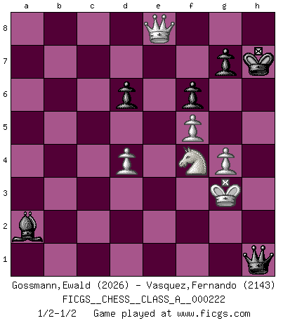 Last move : 1/2-1/2 2020 June 27 9:15:8 [Event "FICGS__CHESS__CLASS_A__000222"] [Site "FICGS"] [Date "2019.12.04"] [Round "1"] [White "Gossmann,Ewald"] [Black "Vasquez,Fernando"] [Result "1/2-1/2"] [WhiteElo "2026"] [BlackElo "2143"] 1.e4 e5 2.Nf3 Nf6 3.Nxe5 d6 4.Nf3 Nxe4 5.d4 d5 6.Bd3 Nc6 7.O-O Bg4 8.c4 Nf6 9.Nc3 dxc4 10.Bxc4 Be7 11.Be3 O-O 12.h3 Bh5 13.g4 Bg6 14.Ne5 Nd7 15.f4 Nb6 16.Nxc6 bxc6 17.Bb3 h6 18.f5 Bh7 19.Qf3 Qd7 20.Bf2 a5 21.Bc2 Nc4 22.Rfe1 Nxb2 23.Be4 Ra6 24.Rac1 Kh8 25.Ne2 Qd6 26.Rc2 Rb6 27.Bg3 Qd8 28.Rxc6 Bd6 29.Bxd6 cxd6 30.Rb1 Na4 31.Rb3 Rxc6 32.Bxc6 Nb6 33.Qc3 Nd7 34.Rb5 Qg5 35.Bxd7 Qe7 36.Qf3 Qxd7 37.Rxa5 f6 38.Qa3 Qc6 39.Kf2 Bg8 40.Qf3 Qb6 41.Ra3 Bc4 42.Nf4 Re8 43.Qc3 Qb1 44.Qd2 Qf1+ 45.Kg3 h5 46.Re3 Qg1+ 47.Kf3 Qh1+ 48.Kg3 Qg1+ 49.Kf3 Rxe3+ 50.Qxe3 hxg4+ 51.hxg4 Qh1+ 52.Kg3 Bxa2 53.Qe8+ Kh7 54.Qg6+ Kh8 55.Qe8+ Kh7 1/2-1/2 Petrov : Classical attack Kingside Castling by player White (move 7) Kingside Castling by player Black (move 11) This chess game ended in a draw. Follow this game move after move (download)Though most people love to look at the games of the great attacking masters, some of the most successful players in history have been the quiet positional players. They slowly grind you down by taking away your space, tying up your pieces, and leaving you with virtually nothing to do ! (Yasser Seirawan) Nicht daß Diemer aus Opportunismus Mitglied der NSDAP geworden wäre. Er war ein Fanatiker, in allem, was er tat. (Hans Ree) La esencia del Ajedrez es pensar acerca de lo que el Ajedrez es. (David Bronstein) Le succès, c'est être capable d'aller d'échec en échec sans perdre son enthousiasme. (Winston Churchill) Wikichess, chess moves explained by 'experimented' players. (Thibault de Vassal)