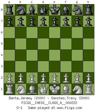 Last move : 0-1 2020 January 13 15:7:55 [Event "FICGS__CHESS__CLASS_A__000222"] [Site "FICGS"] [Date "2019.12.04"] [Round "1"] [White "Banta,Jeremy"] [Black "Sanchez,Tracy"] [Result "0-1"] [WhiteElo "2000"] [BlackElo "2000"] 0-1 This chess game has been lost on time (started : 2019.12.04 2:1:55) Player Black won this chess game. Follow this game move after move (download)I'd rather have a Pawn than a finger. (Reuben Fine) Wenn Spassky eine Figur opfert kannst du genauso gut aufgeben. Aber wenn Tal eine Figur opfert, spiel weiter. Er könnte noch eine weitere opfern, und dann ... wer weiß? (Miguel Najdorf) Todavía soy una víctima del Ajedrez. Tiene toda la belleza del arte y mucho mas. No puede ser comercializado. El Ajedrez es mas puro que el arte en su posición social. (Marcel Duchamp) J'apprécie les joueurs d'est-indienne, c'est grâce à eux que je nourris ma famille depuis tant d'années. (Petrosian) It is not titles that honor men, but men that honor titles. (Niccolo Machiavelli)