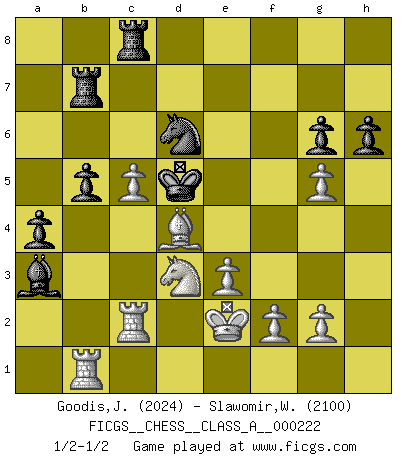 Last move : 1/2-1/2 2020 March 5 19:4:20 [Event "FICGS__CHESS__CLASS_A__000222"] [Site "FICGS"] [Date "2019.12.04"] [Round "1"] [White "Goodis,Johannes"] [Black "Slawomir,Weglicki"] [Result "1/2-1/2"] [WhiteElo "2024"] [BlackElo "2100"] 1.c4 e5 2.Nc3 Nf6 3.Nf3 Nc6 4.e3 Bb4 5.Qc2 O-O 6.Nd5 h6 7.a3 Bd6 8.Nxf6+ Qxf6 9.b4 Re8 10.Bb2 b6 11.Bd3 Bb7 12.Bh7+ Kh8 13.Be4 a5 14.b5 Nd8 15.O-O Rc8 16.Rac1 Bxe4 17.Qxe4 Qg6 18.Qxg6 fxg6 19.d4 exd4 20.Nxd4 Nb7 21.Rfd1 Nc5 22.Ne2 Kg8 23.Rc2 g5 24.h3 Bf8 25.Nc3 c6 26.Kf1 Rc7 27.Rcd2 Kf7 28.Ba1 Re6 29.Rb1 Rb7 30.Rc2 Re8 31.Ne2 Ne4 32.bxc6 dxc6 33.Nd4 Bxa3 34.Nxc6 a4 35.Bd4 Rc8 36.Ne5+ Ke6 37.Ke2 b5 38.Nd3 Nd6 39.c5 Kd5 40.h4 g6 41.hxg5 1/2-1/2 English Opening Kingside Castling by player Black (move 5) Kingside Castling by player White (move 15) This chess game ended in a draw. Follow this game move after move (download)I give 98 percent of my mental energy to Chess. Others give only 2 percent. (Bobby Fischer) Wie bekannt hörte Morphy 1859 auf, Schach zu spielen. Seine Enttäuschung galt nicht so sehr dem Schach, wie den Schachspielern. (Robert James Fischer) Siempre es mucho mejor sacrificar las piezas de tu oponente. (Savielly Tartakover) La conception d'un plan est le processus par lequel un joueur exploite les avantages de sa position tout en s'efforçant d'en réduire au minimum les inconvénients. Afin de garantir le succès, un plan doit toujours se fonder sur un diagnostic objectif des particularités d'une position. La conception d'un plan est d'autant plus difficile que la position est équilibrée, et grandement facilitée lorsqu'il n'existe qu'un seul plan susceptible de répondre aux exigences de la position. (Harry Golombek) If I had no sense of humor, I would long ago have committed suicide. (Mahatma Gandhi)
