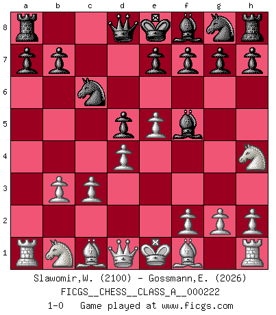 Last move : 1-0 2019 December 16 11:39:3 [Event "FICGS__CHESS__CLASS_A__000222"] [Site "FICGS"] [Date "2019.12.04"] [Round "1"] [White "Slawomir,Weglicki"] [Black "Gossmann,Ewald"] [Result "1-0"] [WhiteElo "2100"] [BlackElo "2026"] 1.e4 c6 2.d4 d5 3.e5 c5 4.Nf3 c4 5.b3 cxb3 6.axb3 Nc6 7.c3 Bf5 8.Nh4 1-0 Caro-Kann : Advance variation Player White won this chess game. Follow this game move after move (download)Don't even mention losing to me. I can't stand to think of it. (Bobby Fischer) Wenn ich mich einlogge, glauben die Leute gewöhnlich nicht, dass ich es selbst bin und sie fangen an, mir dumme Fragen zu stellen. Und wenn sie es glauben, stellen sie wieder andere dumme Fragen. (Judith Polgar) El Ajedrez es una guerra en un tablero. El objetivo es aplastar la mente del oponente. (Bobby Fischer) Les Echecs représentent une sphère d'idées créatrices basée sur la volonté des deux protagonistes. (Smyslov) Gambling : The sure way of getting nothing from something. (Wilson Mizner)