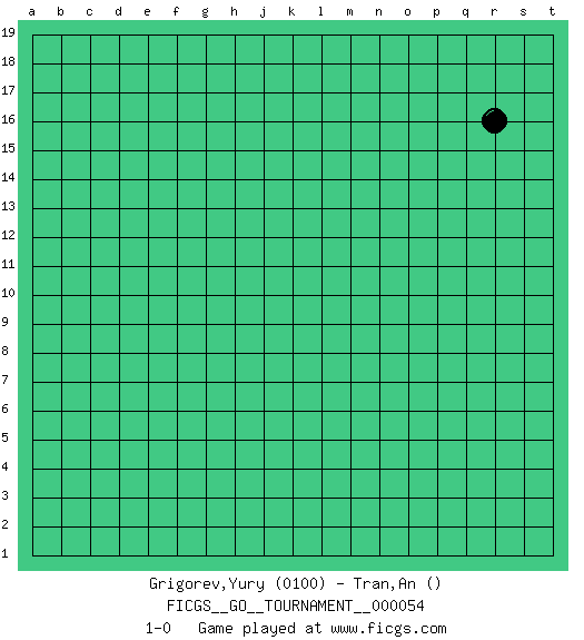 Last move : 1-0 2020 January 7 14:16:18 [Event "FICGS__GO__TOURNAMENT__000054"] [Site "FICGS"] [Date "2019.12.05"] [Round "1"] [Black "Grigorev,Yury"] [White "Tran,An"] [Result "1-0"] [Rating 1 "0100"] 1.r16 1-0 This go game has been lost on time (started : 2019.12.05 19:33:29) Here are the names of the openings (joseki) played in the four corners : Player Black won this Go (weiqi, baduk) game. Follow this game move after move (download)There is damezumari at the bamboo joint. (Anonymous) Think like a man of action, act like a man of thought. (Henri Louis Bergson)