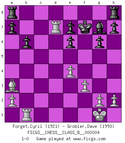 Last move : 1-0 2006 October 24 1:37:0 [Event "FICGS__CHESS__CLASS_B__000004"] [Site "FICGS"] [Date "2006.06.19"] [Round "1"] [White "Forget,Cyril"] [Black "Grobler,Dave"] [Result "1-0"] [WhiteElo "1921"] [BlackElo "1993"] 1.d4 Nf6 2.Nf3 g6 3.c4 Bg7 4.Nc3 d5 5.cxd5 Nxd5 6.e4 Nxc3 7.bxc3 c5 8.Be2 Nc6 9.Rb1 cxd4 10.cxd4 Nxd4 11.Nxd4 Qxd4 12.Bb5+ Kf8 13.O-O Qxd1 14.Rxd1 Bg4 15.f3 Be6 16.Bd7 b6 17.Bxe6 fxe6 18.Rd7 Kf7 19.Ba3 1-0 This chess game has been lost on time (started : 2006.06.19 20:18:36) King's Indian : East Indian defense Kingside Castling by player White (move 13) Player White won this chess game. Follow this game move after move (download)If I win a tournament, I win it by myself. I do the playing. Nobody helps me. (Bobby Fischer) Ein guter Spieler hat immer Glück. (José Raúl Capablanca) No volvere nunca a jugar contigo. Has insultado a mi amigo. - cuando un oponente se maldijo por una mala jugada (Miguel Najdorf) Toute estimation doit être constamment réévaluée. (Jacob Estrin) The modern world has divided itself into Conservatives and Progressives. The business of Progressives is to go on making mistakes. The business of the Conservatives is to prevent the mistakes from being corrected. (G.K. Chesterton)