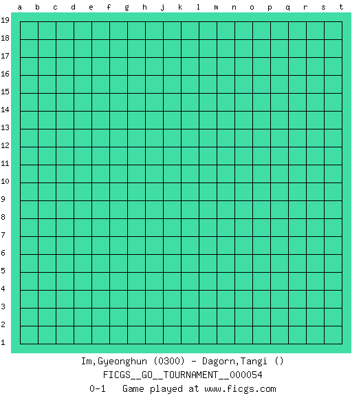 Last move : 0-1 2020 January 4 19:57:41 [Event "FICGS__GO__TOURNAMENT__000054"] [Site "FICGS"] [Date "2019.12.05"] [Round "1"] [Black "Im,Gyeonghun"] [White "Dagorn,Tangi"] [Result "0-1"] [Rating 1 "0300"] 0-1 This go game has been lost on time (started : 2019.12.05 19:33:29) Here are the names of the openings (joseki) played in the four corners : Player White won this Go (weiqi, baduk) game. Follow this game move after move (download)Go is to western chess what philosophy is to double entry accounting. (from Shibumi, by Trevanian) Everything in life is luck. (Donald Trump)