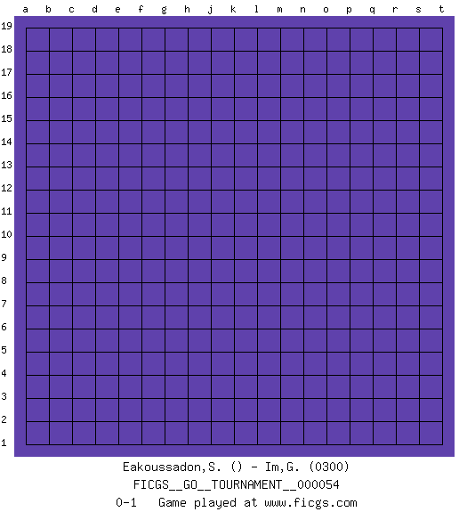 Last move : 0-1 2020 January 4 19:57:41 [Event "FICGS__GO__TOURNAMENT__000054"] [Site "FICGS"] [Date "2019.12.05"] [Round "1"] [Black "Eakoussadon,Suppachai"] [White "Im,Gyeonghun"] [Result "0-1"] [Rating 2 "0300"] 0-1 This go game has been lost on time (started : 2019.12.05 19:33:29) Here are the names of the openings (joseki) played in the four corners : Player White won this Go (weiqi, baduk) game. Follow this game move after move (download)Learn to play under the stones. (Anonymous) Faith : not wanting to know what is true. (Friedrich Nietzsche)