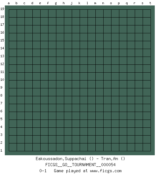 Last move : 0-1 2020 January 4 19:57:41 [Event "FICGS__GO__TOURNAMENT__000054"] [Site "FICGS"] [Date "2019.12.05"] [Round "1"] [Black "Eakoussadon,Suppachai"] [White "Tran,An"] [Result "0-1"] 0-1 This go game has been lost on time (started : 2019.12.05 19:33:29) Here are the names of the openings (joseki) played in the four corners : Player White won this Go (weiqi, baduk) game. Follow this game move after move (download)Don't make dango's. (Anonymous) It's not enough to succeed. Others must fail. (Gore Vidal)