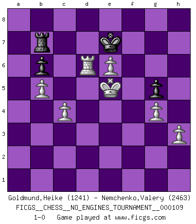 Last move : 1-0 2020 January 25 11:48:27 [Event "FICGS__CHESS__NO_ENGINES_TOURNAMENT__000109"] [Site "FICGS"] [Date "2019.12.08"] [Round "1"] [White "Goldmund,Heike"] [Black "Nemchenko,Valery"] [Result "1-0"] [WhiteElo "1241"] [BlackElo "2463"] 1.e4 e5 2.Nf3 Nc6 3.Bc4 Bc5 4.c3 d6 5.a4 a6 6.b4 Ba7 7.O-O Nf6 8.d3 O-O 9.Be3 Be6 10.Nbd2 h6 11.Qb3 Ng4 12.Bxa7 Rxa7 13.h3 Bxc4 14.Nxc4 Nf6 15.Ne3 Qd7 16.Rad1 Qe6 17.Qb2 b6 18.b5 Na5 19.c4 g6 20.Qc2 Nh5 21.Nd5 f5 22.Qd2 Kh7 23.Qe3 f4 24.Nxc7 fxe3 25.Nxe6 exf2+ 26.Rxf2 Re8 27.g4 Nf6 28.Neg5+ hxg5 29.Nxg5+ Kg7 30.Rdf1 Nh7 31.Rf7+ Rxf7 32.Rxf7+ Kg8 33.Rxh7 axb5 34.axb5 Rb8 35.Rd7 Nb7 36.Nf7 Kf8 37.Nxd6 Nxd6 38.Rxd6 Kf7 39.Kf2 Rb7 40.Ke3 g5 41.d4 exd4+ 42.Kxd4 Rb8 43.e5 Rb7 44.e6+ Ke7 45.Ke5 1-0 Giuoco Piano Kingside Castling by player White (move 7) Kingside Castling by player Black (move 8) Player White won this chess game. Follow this game move after move (download)Chess opens and enriches your mind. (Saudin Robovic) Es gibt nur zwei wahre Schachgenies - das andere war Wilhelm Steinitz, der Weltmeister von 1872 bis 1894. (Robert James Fischer) Fischer era un maestro de claridad y un Rey del posicionamiento astuto. Sus oponentes podían ver hacia donde se dirigía pero eran impotentes para detenerlo. (Bruce Pandolfini) C'est une question de caractère, Beaucoup de gens perdent leur motivation très vite. D'autres, ils sont rares, peuvent la conserver très longtemps. J'aime les échecs, encore aujourd'hui je suis heureux d'analyser des parties. J'aime toujours gagner, je déteste encore perdre. Bien jouer est important pour mon intégrité intellectuelle et morale. Et puis les échecs vivent en ce moment une période historique grâce à Internet. Ils se développent dans les systèmes éducatifs à travers le monde. Ils sortent de leur ghetto, et c'est mon rôle de mener à bien cette révolution. (Gary Kasparov) It is the aim of the modern school, not to treat every position according to one general law, but according to the principle inherent in the position. (Richard Reti)