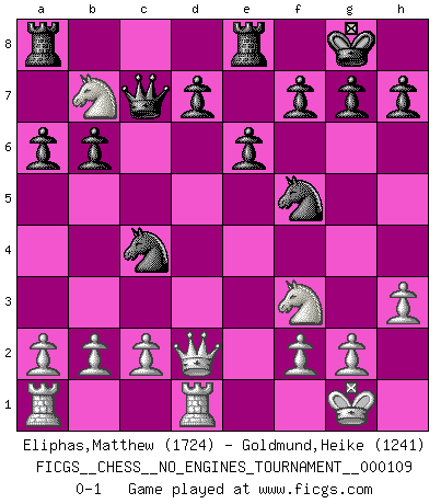 Last move : 0-1 2020 March 12 12:21:44 [Event "FICGS__CHESS__NO_ENGINES_TOURNAMENT__000109"] [Site "FICGS"] [Date "2019.12.08"] [Round "1"] [White "Eliphas,Matthew"] [Black "Goldmund,Heike"] [Result "0-1"] [WhiteElo "1724"] [BlackElo "1241"] 1.d4 Nf6 2.Nf3 e6 3.Nc3 c5 4.Bf4 Nc6 5.dxc5 Bxc5 6.e4 O-O 7.Bc4 b6 8.O-O Bb7 9.Bd6 Bxd6 10.Qxd6 Re8 11.e5 Ng4 12.h3 Nh6 13.Qd2 Nf5 14.Rfd1 a6 15.Ne4 Nxe5 16.Nd6 Nxc4 17.Nxb7 Qc7 0-1 Queen's pawn game Kingside Castling by player Black (move 6) Kingside Castling by player White (move 8) Player Black won this chess game. Follow this game move after move (download)Blessed be the memory of him who gave the world this immortal game. (A. G. Gardiner) Ich hatte meine größten Erfolge, als ich 47 Jahre alt war. Kasparow war noch nicht mal 42 und hat das Schach schon im Stich gelassen. (Viktor Kortschnoi) Bobby es la celebridad menos entendida y malinterpretada que camina el la faz de esta tierra. (Yasser Seirawan) Si je n'étais pas joueur d'échecs, je serais le meilleur dans quelque chose d'autre. (Anatoli Karpov) That's absurd. I love it. (Gregory House, House M.D.)