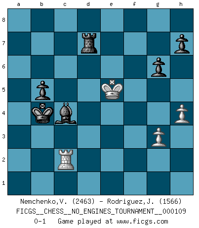 Last move : 0-1 2020 February 7 19:47:14 [Event "FICGS__CHESS__NO_ENGINES_TOURNAMENT__000109"] [Site "FICGS"] [Date "2019.12.08"] [Round "1"] [White "Nemchenko,Valery"] [Black "Rodriguez,Juan Antonio"] [Result "0-1"] [WhiteElo "2463"] [BlackElo "1566"] 1.e4 c5 2.Nf3 g6 3.Nc3 Bg7 4.d4 cxd4 5.Nxd4 Nc6 6.Nxc6 dxc6 7.Bc4 e6 8.O-O Qc7 9.Be3 Nf6 10.Qd2 O-O 11.h3 b5 12.Bb3 a6 13.f4 c5 14.e5 c4 15.Bxc4 Qxc4 16.b3 Qc6 17.a4 Nd5 18.Nxd5 exd5 19.Rac1 Bf5 20.c3 Be4 21.Rfd1 Rac8 22.Kf2 Qb7 23.Bd4 f6 24.exf6 Bxf6 25.Qe2 Bxd4+ 26.Rxd4 Rxf4+ 27.Kg1 Rcf8 28.Qe1 Qf7 29.c4 Rf2 30.Rd2 Rxd2 31.Qxd2 dxc4 32.bxc4 Qa7+ 33.c5 Rc8 34.Qd4 Qb7 35.Qf2 Rf8 36.Qa2+ Qd5 37.Qxd5+ Bxd5 38.axb5 axb5 39.c6 Rc8 40.c7 Bc4 41.Kf2 Rxc7 42.Ke3 Rd7 43.Rc2 Kf7 44.Kf4 Ke6 45.h4 Kd6 46.g3 Kc5 47.Ke5 Kb4 0-1 Sicilian : Hungarian variation Kingside Castling by player White (move 8) Kingside Castling by player Black (move 10) 10 pieces endgame at move 41 : White KRPP , Black KRBPPP WHITE : King + 1 Rook 2 Pawns BLACK : King + 1 Rook 1 Bishop 3 Pawns Player Black won this chess game. Follow this game move after move (download)For surely of all the drugs in the world, Chess must be the most permanently pleasurable. (Assiac) Jeder weiß, dass Gasprom Putins persönliches Machtinstrument ist. Die Firma wird vom Kreml aus geleitet und wird schon deshalb nie transparent sein. (Garry Kasparov) El Ajedrez es un juego de pelea el cual es puramente intelectual e incluye la suerte. (Richard Reti) Votre seul travail dans les ouvertures est d'obtenir un milieu de partie jouable. (Lajos Portish) Quotation,n.: The act of repeating erroneously the words of another. The words erroneously repeated. (Ambrose Bierce, The Devil's Dictionary)