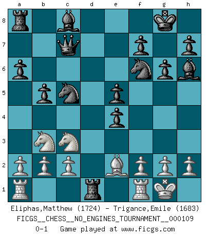 Last move : 0-1 2019 December 31 6:46:53 [Event "FICGS__CHESS__NO_ENGINES_TOURNAMENT__000109"] [Site "FICGS"] [Date "2019.12.08"] [Round "1"] [White "Eliphas,Matthew"] [Black "Trigance,Emile"] [Result "0-1"] [WhiteElo "1724"] [BlackElo "1683"] 1.d4 g6 2.Nc3 Bg7 3.e3 d5 4.Be2 Nf6 5.Nf3 Nbd7 6.O-O O-O 7.Bd2 c5 8.Nb5 a6 9.Nc3 Qc7 10.Qc1 cxd4 11.Nxd4 e5 12.Nb3 b5 13.e4 dxe4 14.Bh6 Nc5 15.Nd2 Bxh6 16.Qd1 Rd8 17.Nb3 Rxd1 0-1 Modern defense Kingside Castling by player White (move 6) Kingside Castling by player Black (move 6) Player Black won this chess game. Follow this game move after move (download)The sign of a great Master is his ability to win a won game quickly and painlessly. (Irving Chernev) Über Karpov: Er war und ist ein Vertreter der russischen Reaktionäre. Das steckt tief in seiner Seele, wehalb ich nicht nett mit ihm umgehen kann. (Viktor Kortschnoi) ¿Se han dado cuenta de que Fischer casi nunca ha tenido piezas malas? El las intercambia y las piezas malas se quedan con sus oponenets. (Yuri Balashov) Pour moi, les échecs ne sont pas un jeu mais un art. (Alexandre Alekhine) Good decisions come from experience, and experience comes from bad decisions. (Anonymous)