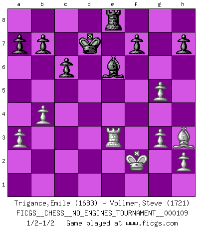 Last move : 1/2-1/2 2019 December 28 11:24:43 [Event "FICGS__CHESS__NO_ENGINES_TOURNAMENT__000109"] [Site "FICGS"] [Date "2019.12.08"] [Round "1"] [White "Trigance,Emile"] [Black "Vollmer,Steve"] [Result "1/2-1/2"] [WhiteElo "1683"] [BlackElo "1721"] 1.e4 Nf6 2.e5 Nd5 3.d4 d6 4.c4 Nb6 5.f4 g5 6.exd6 exd6 7.Qe2+ Qe7 8.Qxe7+ Bxe7 9.fxg5 Nc6 10.Nf3 Bf5 11.Bd2 O-O-O 12.Bc3 Rhe8 13.Kf2 d5 14.Nbd2 dxc4 15.Nxc4 Nd5 16.g3 Ndb4 17.a3 Nc2 18.Rd1 Bc5 19.b4 Bxd4+ 20.Nxd4 N6xd4 21.Bxd4 Nxd4 22.Ne3 Be6 23.Bg2 c6 24.Rd3 Nf5 25.Rhd1 Rxd3 26.Rxd3 Kc7 27.Nxf5 Bxf5 28.Re3 Be6 29.Bh3 Kd7 1/2-1/2 Alekhine's defense : Four pawns attack, Planinc variation Queenside Castling by player Black (move 11) This chess game ended in a draw. Follow this game move after move (download)Modern Chess is too much concerned with things like Pawn structure. Forget it, Checkmate ends the game. (Nigel Short) Woher wissen wir, daß der Neanderthaler Blindschach gespielt hat? -- Bei Ausgrabungen wurden keine Schachbretter und Figuren gefunden. (Anonymous) Durante una competencia de Ajedrez, un Maestro de Ajedrez deberá ser una combinación de presa de caza y un Monge. (Alexander Alekhine) Ce qui caractérise les parties de combat, c'est que si le défenseur a constamment de difficiles problèmes à résoudre, l'attaquant doit chercher sans relâche de nouvelles possibilités d'attaque. (Koblentz) When a man with money meets a man with experience, the man with experience leaves with money and the man with money leaves with experience. (Anonymous)