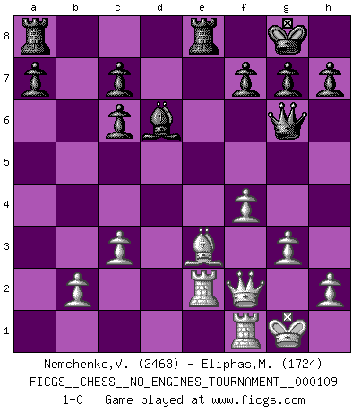 Last move : 1-0 2020 March 1 15:22:19 [Event "FICGS__CHESS__NO_ENGINES_TOURNAMENT__000109"] [Site "FICGS"] [Date "2019.12.08"] [Round "1"] [White "Nemchenko,Valery"] [Black "Eliphas,Matthew"] [Result "1-0"] [WhiteElo "2463"] [BlackElo "1724"] 1.e4 e6 2.d4 d5 3.Nc3 dxe4 4.Nxe4 Bd7 5.Nf3 Nc6 6.Be2 Be7 7.O-O Nf6 8.Nxf6+ Bxf6 9.c3 O-O 10.Bd3 e5 11.Nxe5 Nxe5 12.dxe5 Bxe5 13.Be3 Qh4 14.f4 Qh6 15.Qc2 Bd6 16.Qf2 Rfe8 17.Rae1 Bc6 18.g3 Qh5 19.Be2 Qd5 20.Bf3 Qxa2 21.Bxc6 bxc6 22.Ra1 Qe6 23.Rae1 Qg6 24.Re2 1-0 French : Rubinstein variation Kingside Castling by player White (move 7) Kingside Castling by player Black (move 9) Player White won this chess game. Follow this game move after move (download)Chess is not like life... it has rules ! (Mark Pasternak) Der Freibauer hat für mich eine Seele, genau wie der Mensch, Wünsche, die unerkannt in ihm schlummern, und Befürchtungen, von deren Existenz er selbst kaum ahnt. (Aaron Nimzowitsch) Es el objetivo de la escuela moderna no tratar cada posición de acuerdo a una regla general, sino de acuerdo al principio inherente en la posición. (Richard Reti) Je ne crois pas en la psychologie, je crois aux bons coups. (Robert Fischer) Never risk one's whole fortune unless supported by one's entire army. (Niccolo Machiavelli)