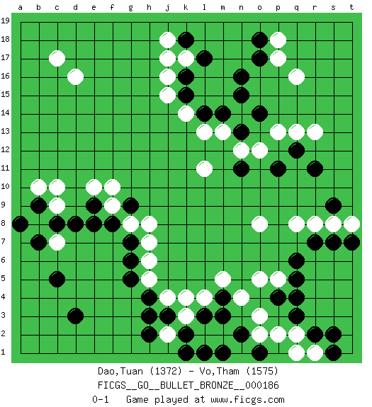 Last move : 0-1 2019 December 9 1:57:19 [Event "FICGS__GO__BULLET_BRONZE__000186"] [Site "FICGS"] [Date "2019.12.09"] [Round "1"] [Black "Dao,Tuan"] [White "Vo,Tham"] [Result "0-1"] [Rating 1 "1372"] [Rating 2 "1575"] 1.q4 d16 2.d3 q16 3.c5 k3 4.h3 o3 5.m3 o5 6.q6 l4 7.m4 m5 8.q3 r8 9.r7 q8 10.r11 r13 11.p11 o8 12.n11 l11 13.n13 p13 14.q12 l13 15.n16 q13 16.s9 s8 17.s7 t8 18.t7 n14 19.m14 m13 20.o14 n12 21.n15 o12 22.l14 p17 23.o17 p18 24.o18 j17 25.l17 k14 26.k15 j15 27.k16 j16 28.k18 c10 29.c8 e10 30.e8 f9 31.f8 g8 32.g7 h7 33.g9 h8 34.e9 f10 35.g6 h6 36.g5 h5 37.h4 j4 38.k2 j2 39.l3 l2 40.k1 m2 41.j3 k4 42.h2 j18 43.n2 o2 44.m1 n4 45.l1 b8 46.b7 c7 47.b9 c9 48.d8 b10 49.a8 q2 50.r2 p2 51.o1 r1 52.s2 c17 53.s1 q1 54.p4 p5 55.q5 k17 0-1 Here are the names of the openings (joseki) played in the four corners : Corner q4 : q4 o3 Hoshi (Hwajeom, Seongjeom, Xingwei`) 4-4 Point. The star or hoshi (4-4) point, emphasizing influence at the potential expense of territory. Ikken Kakari (Hankan Keolch'im, Yi Gua`jiao~, 1-Space Low Approach). White 2 is the standard approach move to the 4-4. Corner q16 : q16 r11 Hoshi (Hwajeom, Seongjeom, Xingwei`) 4-4 Point. The star or hoshi (4-4) point, emphasizing influence at the potential expense of territory. Player White won this Go (weiqi, baduk) game. Follow this game move after move (download)If there is no stone on the handicap point, the carpenter's square is dead. (Anonymous) Gambling : The sure way of getting nothing from something. (Wilson Mizner)