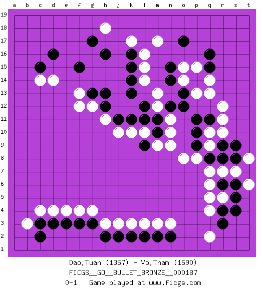 Last move : 0-1 2019 December 9 2:13:42 [Event "FICGS__GO__BULLET_BRONZE__000187"] [Site "FICGS"] [Date "2019.12.09"] [Round "1"] [Black "Dao,Tuan"] [White "Vo,Tham"] [Result "0-1"] [Rating 1 "1357"] [Rating 2 "1590"] 1.q16 q4 2.d16 c4 3.e3 h3 4.c3 b3 5.c2 d4 6.d3 e4 7.f3 f4 8.g3 g4 9.h2 j3 10.j2 k3 11.k2 l3 12.l2 m3 13.m2 n3 14.n2 c14 15.c15 d14 16.f15 f13 17.h16 k17 18.o17 h18 19.g17 m17 20.k16 l16 21.k15 l15 22.k14 l14 23.k13 m12 24.g13 g12 25.h13 f12 26.h12 h11 27.j11 j10 28.k11 k10 29.l11 m9 30.m10 n10 31.l9 l10 32.m11 n11 33.l12 n9 34.n12 m13 35.o12 o14 36.p14 p13 37.o13 q13 38.n14 o15 39.n15 p15 40.q15 q14 41.p11 r11 42.p9 q10 43.p10 q9 44.q11 r12 45.q8 p8 46.r9 r10 47.s9 o8 48.r6 q7 49.r8 q6 50.r4 r5 51.s5 q5 52.r3 r7 53.s6 s7 54.t7 t8 55.s8 t6 56.s4 q2 0-1 Here are the names of the openings (joseki) played in the four corners : Corner d4 : c4 e3 Komoku (Somok, Xiao~mu`) 3-4 Point. The komoku (3-4) point is the traditional corner enclosure move.. Ikken Kakari (Hankan Keolch'im, Yi Gua`jiao~, 1-Space Low Pincer). The small knight move is the basic approach move to the 3-4 point stone. It has been continually used for over four centuries. There are limitless variations, with new moves constantly being discovered. Black 2 opens the door to a treaure store of joseki. Corner d16 : d16 c14 Hoshi (Hwajeom, Seongjeom, Xingwei`) 4-4 Point. The star or hoshi (4-4) point, emphasizing influence at the potential expense of territory. Ikken Kakari (Hankan Keolch'im, Yi Gua`jiao~, 1-Space Low Approach). White 2 is the standard approach move to the 4-4. Player White won this Go (weiqi, baduk) game. Follow this game move after move (download)Keep sente in the opening. A premature attack loses sente. (Anonymous) A good book on your shelf is a friend that turns its back on you and remains a friend. (Author unknown)