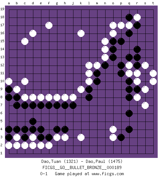 Last move : 0-1 2019 December 9 4:6:27 [Event "FICGS__GO__BULLET_BRONZE__000189"] [Site "FICGS"] [Date "2019.12.09"] [Round "1"] [Black "Dao,Tuan"] [White "Dao,Paul"] [Result "0-1"] [Rating 1 "1321"] [Rating 2 "1475"] 1.q4 d16 2.q16 d3 3.q10 o17 4.r14 k16 5.d5 d8 6.c3 c2 7.c4 g3 8.c7 c8 9.b8 b9 10.a8 c10 11.d7 e8 12.e7 f8 13.f7 g8 14.g7 h8 15.h7 j8 16.j7 k3 17.g4 h3 18.h4 o3 19.p3 o4 20.q6 f17 21.a9 a10 22.b7 c15 23.f3 f2 24.e3 e2 25.e4 b3 26.b4 b2 27.d4 d2 28.a3 a2 29.a4 r8 30.q8 r10 31.r9 s9 32.q9 s7 33.s10 r11 34.s11 s12 35.r12 q11 36.p11 q12 37.r13 t10 38.p12 t11 39.q13 l12 40.m11 l11 41.m10 l10 42.l9 k9 43.l8 m12 44.n12 n13 45.o13 n14 46.o14 n15 47.o15 o16 48.p15 q17 49.r17 r18 50.q18 p17 0-1 Here are the names of the openings (joseki) played in the four corners : Corner q16 : q16 o17 Hoshi (Hwajeom, Seongjeom, Xingwei`) 4-4 Point. The star or hoshi (4-4) point, emphasizing influence at the potential expense of territory. Ikken Kakari (Hankan Keolch'im, Yi Gua`jiao~, 1-Space Low Approach). White 2 is the standard approach move to the 4-4. Corner d4 : d3 d5 Komoku (Somok, Xiao~mu`) 3-4 Point. The komoku (3-4) point is the traditional corner enclosure move.. Ikken Takagakari (Hankan Nop'dakeolch'im, Yi Gaogua`jiao~, 1-Space High Approach). The 5-4 approach move has become more popular in modern times, as modern Go emphasizes speed and influence. Corner q4 : q4 o3 Hoshi (Hwajeom, Seongjeom, Xingwei`) 4-4 Point. The star or hoshi (4-4) point, emphasizing influence at the potential expense of territory. Ikken Kakari (Hankan Keolch'im, Yi Gua`jiao~, 1-Space Low Approach). White 2 is the standard approach move to the 4-4. Player White won this Go (weiqi, baduk) game. Follow this game move after move (download)In opponents' sphere of influence, avoid sharp conflict, don't move too deep. (Otake Hideo, 9p) A proverb is a short sentence based on long experience. (Miguel de Cervantes)