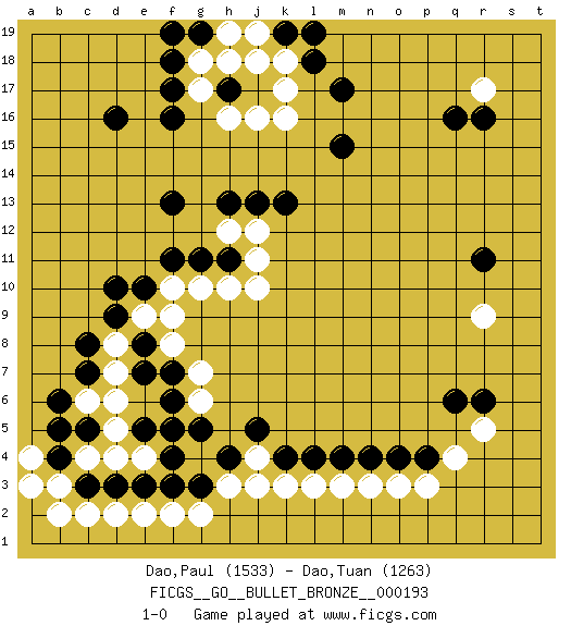 Last move : 1-0 2019 December 9 8:55:58 [Event "FICGS__GO__BULLET_BRONZE__000193"] [Site "FICGS"] [Date "2019.12.09"] [Round "1"] [Black "Dao,Paul"] [White "Dao,Tuan"] [Result "1-0"] [Rating 1 "1533"] [Rating 2 "1263"] 1.q16 q4 2.d16 d4 3.r6 r5 4.q6 r9 5.p4 p3 6.o4 o3 7.n4 n3 8.m4 m3 9.l4 l3 10.k4 k3 11.h4 h3 12.g3 j3 13.g5 g2 14.f3 f2 15.e3 e2 16.d3 d2 17.c3 c2 18.d10 b3 19.b4 a3 20.r11 c4 21.b5 d6 22.c7 c6 23.b6 d7 24.c8 d8 25.d9 e9 26.e10 f9 27.f7 f10 28.f11 h10 29.g11 g10 30.h11 j10 31.e8 f8 32.e7 j11 33.h13 j12 34.j13 h12 35.f13 g7 36.f6 j4 37.j5 g6 38.f5 e4 39.c5 d5 40.f4 a4 41.e5 b2 42.k13 k16 43.m17 h16 44.f16 g17 45.f17 g18 46.f18 k17 47.l18 k18 48.g19 h19 49.f19 j18 50.k19 j19 51.l19 j16 52.h17 h18 53.m15 r17 54.r16 1-0 Here are the names of the openings (joseki) played in the four corners : Corner q4 : q4 r6 Hoshi (Hwajeom, Seongjeom, Xingwei`) 4-4 Point. The star or hoshi (4-4) point, emphasizing influence at the potential expense of territory. Ikken Kakari (Hankan Keolch'im, Yi Gua`jiao~, 1-Space Low Approach). Black 2 is the standard approach move to the 4-4. Corner d4 : d4 h4 Hoshi (Hwajeom, Seongjeom, Xingwei`) 4-4 Point. The star or hoshi (4-4) point, emphasizing influence at the potential expense of territory. Player Black won this Go (weiqi, baduk) game. Follow this game move after move (download)Strange things happen at the one-two points. (Anonymous) Live, lose, and learn, by observing your opponent how to win. (Amber Steenbock)