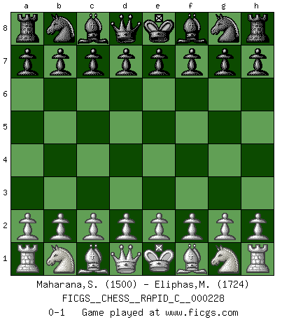 Last move : 0-1 2020 January 8 15:1:18 [Event "FICGS__CHESS__RAPID_C__000228"] [Site "FICGS"] [Date "2019.12.09"] [Round "1"] [White "Maharana,Shiva Prasad"] [Black "Eliphas,Matthew"] [Result "0-1"] [WhiteElo "1500"] [BlackElo "1724"] 0-1 This chess game has been lost on time (started : 2019.12.09 11:56:16) Player Black won this chess game. Follow this game move after move (download)Is Bobby Fischer quite sane ? (Salo Flohr) Stil? Ich habe keinen Stil! (Anatoly Karpov) El Ajedrez tiene tanto misterio como las mujeres. (Purdy) Un millionnaire : 'Monsieur Steinitz ! Vous ne participez aux tournois que pour l'argent, alors que moi je n'y viens que pour l'honneur.' Steinitz : 'Chacun joue pour ce qu'il n'a pas'... The only sure thing about luck is that it will change. (Wilson Mizner)