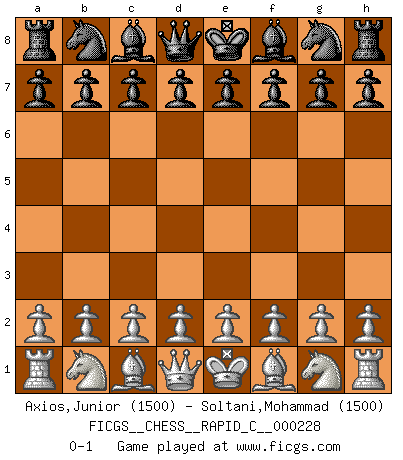 Last move : 0-1 2020 January 8 15:1:18 [Event "FICGS__CHESS__RAPID_C__000228"] [Site "FICGS"] [Date "2019.12.09"] [Round "1"] [White "Axios,Junior"] [Black "Soltani,Mohammad"] [Result "0-1"] [WhiteElo "1500"] [BlackElo "1500"] 0-1 This chess game has been lost on time (started : 2019.12.09 11:56:16) Player Black won this chess game. Follow this game move after move (download)We must make sure that Chess will not be like a dead language, very interesting, but for a very small group. (Sytze Faber) Mein erstes Ziel war nicht, die Partie zu gewinnen, sondern eine Figur zu opfern. -- der junge (Wilhelm Steinitz) El jugador blanco perdió porque fallo en recordar la coreccta continuación y tuvo que pensar por sí mismo las movidas. (Siegbert Tarrasch) Celui qui prend des risques peut perdre, celui qui n'en prend pas perd toujours. (Xavier Tartacover) You must have a dream in order to have it come true. (A.P.J. Kalam)
