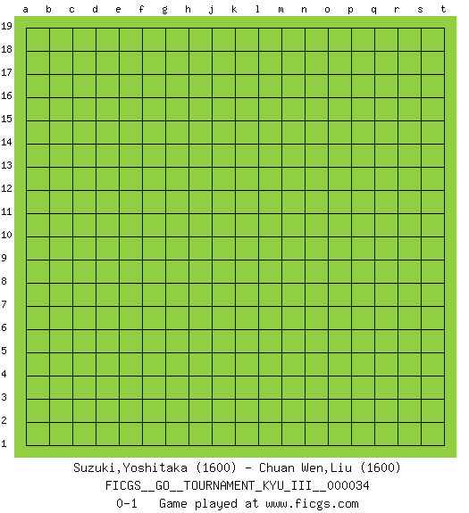 Last move : 0-1 2020 January 9 3:13:6 [Event "FICGS__GO__TOURNAMENT_KYU_III__000034"] [Site "FICGS"] [Date "2019.12.09"] [Round "1"] [Black "Suzuki,Yoshitaka"] [White "Chuan Wen,Liu"] [Result "0-1"] [Rating 1 "1600"] [Rating 2 "1600"] 0-1 This go game has been lost on time (started : 2019.12.09 23:5:56) Here are the names of the openings (joseki) played in the four corners : Player White won this Go (weiqi, baduk) game. Follow this game move after move (download)Six eyes in a rectangle are alive. (Anonymous) Luck is what you have left over after you give 100 percent. (Langston Coleman)