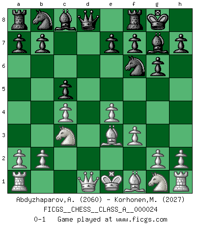 Last move : 0-1 2007 August 24 11:22:4 [Event "FICGS__CHESS__CLASS_A__000024"] [Site "FICGS"] [Date "2007.06.30"] [Round "1"] [White "Abdyzhaparov,Aydar"] [Black "Korhonen,Marko"] [Result "0-1"] [WhiteElo "2060"] [BlackElo "2027"] 1.d4 Nf6 2.c4 g6 3.Nc3 Bg7 4.e4 d6 5.f3 O-O 6.Be3 c5 7.dxc5 dxc5 0-1 This chess game has been lost on time (started : 2007.06.30 10:16:41) King's Indian : Saemisch, 5...O-O Kingside Castling by player Black (move 5) Player Black won this chess game. Follow this game move after move (download)Though most people love to look at the games of the great attacking masters, some of the most successful players in history have been the quiet positional players. They slowly grind you down by taking away your space, tying up your pieces, and leaving you with virtually nothing to do ! (Yasser Seirawan) Sitze auf Deine Hände. (Siegbert Tarrasch) Un Peón pasado aumenta su poder a medida de que el número de piezas en el tablero disminuye. (Capablanca) Les échecs sont un jeu terrible. Si vous n'avez pas le centre, votre adversaire a une position plus libre. Par contre, si vous avez le centre, alors vous avez vraiment quelque chose pour laquelle vous inquiéter ! (Siegbert Tarrasch) When you have everything, sometimes it feels like nothing. (Horatio Caine, C.S.I. Miami)