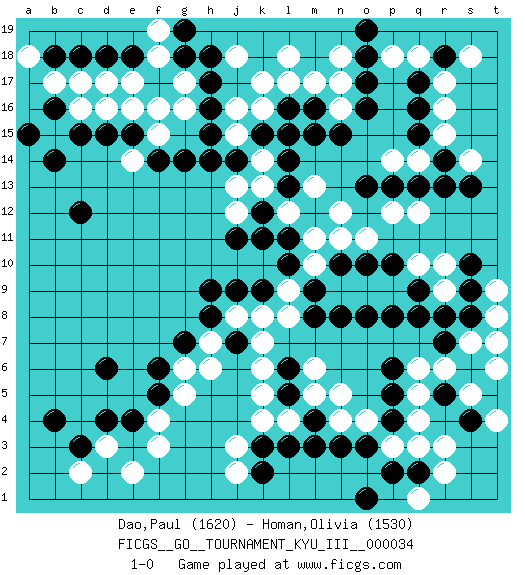Last move : 1-0 2020 January 9 8:41:2 [Event "FICGS__GO__TOURNAMENT_KYU_III__000034"] [Site "FICGS"] [Date "2019.12.09"] [Round "1"] [Black "Dao,Paul"] [White "Homan,Olivia"] [Result "1-0"] [Rating 1 "1620"] [Rating 2 "1530"] 1.q16 d17 2.d4 r3 3.c15 e16 4.c12 f3 5.d6 r17 6.q17 r16 7.r14 r15 8.q15 s14 9.h17 c16 10.d15 k17 11.f17 d16 12.h15 n17 13.r18 s18 14.s13 q14 15.r13 q18 16.o16 p18 17.f14 b15 18.b14 e14 19.e15 f15 20.b16 b17 21.a15 f16 22.g14 g16 23.h16 g17 24.o13 d3 25.c3 c2 26.b4 e2 27.e4 f4 28.f5 g5 29.f6 g6 30.g7 h7 31.h8 j8 32.j7 h6 33.h9 k7 34.g18 f18 35.j9 k8 36.n3 o4 37.o3 p3 38.p2 q3 39.k3 n4 40.m4 l4 41.m3 m5 42.l5 k4 43.l3 r10 44.p10 q12 45.q13 o11 46.k9 l9 47.l10 m10 48.m9 l8 49.l11 m11 50.m12 p12 51.m8 k5 52.o10 n11 53.r8 r9 54.q8 n9 55.n8 o9 56.o8 p9 57.q9 q10 58.p4 n5 59.r5 q5 60.l6 k6 61.p5 q4 62.p6 m6 63.s4 r6 64.s6 q6 65.p8 s7 66.s8 t6 67.n10 j2 68.q2 r2 69.t5 s5 70.k2 k14 71.s6 q1 72.o1 s5 73.e18 e17 74.s6 p14 75.p13 s5 76.m16 n16 77.s6 t7 78.r7 s5 79.n15 t4 80.o17 m17 81.l16 k16 82.o18 l17 83.m15 n18 84.o19 j18 85.h18 l12 86.j11 m13 87.k12 n12 88.l14 k13 89.l13 j12 90.k11 l18 91.k15 j15 92.l15 j16 93.j14 t8 94.s9 t9 95.s10 j3 96.d18 f19 97.c18 c17 98.b18 a18 99.g19 j13 100.h14 1-0 Here are the names of the openings (joseki) played in the four corners : Corner d16 : d17 c15 Komoku (Somok, Xiao~mu`) 3-4 Point. The komoku (3-4) point is the traditional corner enclosure move.. Ikken Kakari (Hankan Keolch'im, Yi Gua`jiao~, 1-Space Low Pincer). The small knight move is the basic approach move to the 3-4 point stone. It has been continually used for over four centuries. There are limitless variations, with new moves constantly being discovered. Black 2 opens the door to a treaure store of joseki. Corner d4 : d4 f3 Hoshi (Hwajeom, Seongjeom, Xingwei`) 4-4 Point. The star or hoshi (4-4) point, emphasizing influence at the potential expense of territory. Ikken Kakari (Hankan Keolch'im, Yi Gua`jiao~, 1-Space Low Approach). White 2 is the standard approach move to the 4-4. Corner q16 : q16 r17 Hoshi (Hwajeom, Seongjeom, Xingwei`) 4-4 Point. The star or hoshi (4-4) point, emphasizing influence at the potential expense of territory. Corner q4 : r3 n3 San-San (Sam-Sam, San-San) 3-3 Point. The San-San (3-3) point, emphasizing territory at the expense of influence. Player Black won this Go (weiqi, baduk) game. Follow this game move after move (download)When in doubt, remove the enemy stones from the board. (Bill Taylor) History is a gallery of pictures in which there are few originals and many copies. (Alexis de Tocqueville)