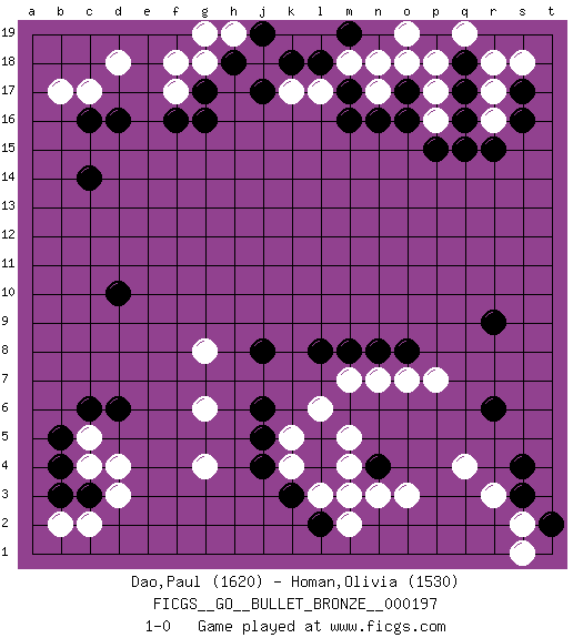 Last move : 1-0 2019 December 9 23:28:13 [Event "FICGS__GO__BULLET_BRONZE__000197"] [Site "FICGS"] [Date "2019.12.09"] [Round "1"] [Black "Dao,Paul"] [White "Homan,Olivia"] [Result "1-0"] [Rating 1 "1620"] [Rating 2 "1530"] 1.q16 q4 2.d16 d4 3.r6 o3 4.s4 r3 5.r9 k4 6.c6 c5 7.d6 g4 8.d10 f17 9.c14 d18 10.g17 c17 11.f16 f18 12.g16 g18 13.j17 j18 14.k18 k17 15.h18 h19 16.j19 g19 17.c3 d3 18.b5 c4 19.b4 c2 20.b3 b2 21.m3 m4 22.n4 n3 23.l4 m5 24.l5 l3 25.k3 m2 26.l2 m3 27.j4 k5 28.j5 l6 29.j6 g6 30.j8 g8 31.l8 m7 32.m8 n7 33.n8 o7 34.o8 p7 35.s3 s2 36.t2 s1 37.c16 b17 38.o16 l17 39.l18 m18 40.m17 n17 41.m16 n18 42.n16 p18 43.q18 p17 44.q17 p16 45.p15 q19 46.q15 r18 47.o17 o18 48.s17 s18 49.p19 o19 50.m19 r17 51.s16 r16 52.r15 1-0 Here are the names of the openings (joseki) played in the four corners : Corner q4 : q4 r6 Hoshi (Hwajeom, Seongjeom, Xingwei`) 4-4 Point. The star or hoshi (4-4) point, emphasizing influence at the potential expense of territory. Ikken Kakari (Hankan Keolch'im, Yi Gua`jiao~, 1-Space Low Approach). Black 2 is the standard approach move to the 4-4. Corner d4 : d4 c6 Hoshi (Hwajeom, Seongjeom, Xingwei`) 4-4 Point. The star or hoshi (4-4) point, emphasizing influence at the potential expense of territory. Ikken Kakari (Hankan Keolch'im, Yi Gua`jiao~, 1-Space Low Approach). Black 2 is the standard approach move to the 4-4. Corner d16 : d16 f17 Hoshi (Hwajeom, Seongjeom, Xingwei`) 4-4 Point. The star or hoshi (4-4) point, emphasizing influence at the potential expense of territory. Ikken Kakari (Hankan Keolch'im, Yi Gua`jiao~, 1-Space Low Approach). White 2 is the standard approach move to the 4-4. Player Black won this Go (weiqi, baduk) game. Follow this game move after move (download)I really believe that Go is destined to take the place of Chess as the leading intellectual game of the Occident, just as it has reigned supreme in the Orient for some four thousand years. (Edward Lasker, international chess master) The intuitive mind is a sacred gift; the rational mind is a faithful servant. We have created a society that honors the servant but has forgotten the gift. (Albert Einstein)