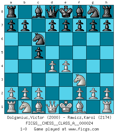 Last move : 1-0 2007 August 10 14:57:58 [Event "FICGS__CHESS__CLASS_A__000024"] [Site "FICGS"] [Date "2007.06.30"] [Round "1"] [White "Dolganiuc,Victor"] [Black "Rawicz,Karol"] [Result "1-0"] [WhiteElo "2000"] [BlackElo "2174"] 1.e4 c5 2.Nf3 Nc6 3.d4 1-0 This chess game has been lost on time (started : 2007.06.30 10:16:41) Sicilian defense Player White won this chess game. Follow this game move after move (download)My style is somewhere between that of Tal and Petrosian. (Reshevsky) Ich hatte Zahnschmerzen im ersten Spiel. In der zweiten Partie tat mir der Kopf weh. In der dritten war es eine Rheuma-Attacke und während der vierten fühlte ich mich nicht gut. Und in der fünften? Nun, man muss doch nicht jedes Spiel gewinnen, oder? (Savielly Grigorievitsch Tartakower) El Ajedrez es un cuento de Hadas de las 1001 metidas de pata. (Savielly Tartakower) Mon pion favori sur ma case favorite ! Bronstein en parlant d'un coup de pion en h5 quand il avait les Noirs. The Internet is so big, so powerful and pointless that for some people it is a complete substitute for life. (Andrew Brown)