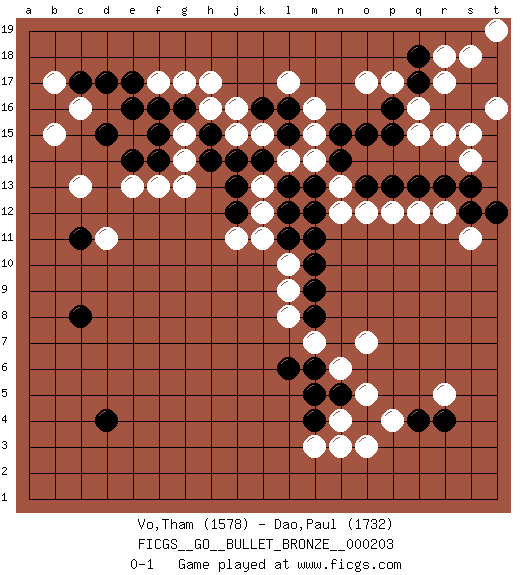 Last move : 0-1 2019 December 10 1:39:59 [Event "FICGS__GO__BULLET_BRONZE__000203"] [Site "FICGS"] [Date "2019.12.10"] [Round "1"] [Black "Vo,Tham"] [White "Dao,Paul"] [Result "0-1"] [Rating 1 "1578"] [Rating 2 "1732"] 1.d4 q16 2.q4 c16 3.e16 g17 4.c17 b17 5.d17 b15 6.d15 c13 7.c11 e13 8.c8 g15 9.f15 g14 10.f14 f13 11.g16 h16 12.f16 h17 13.h15 j15 14.h14 g13 15.j14 k15 16.k14 l14 17.l13 m14 18.m13 n13 19.n14 m16 20.o13 n12 21.n15 k13 22.l15 m15 23.l16 l17 24.k16 j16 25.j13 k12 26.j12 j11 27.l12 k11 28.l11 l10 29.m11 o12 30.p13 p12 31.q13 q12 32.r13 r12 33.s12 s11 34.t12 s14 35.s13 r15 36.s16 s15 37.p15 o17 38.p16 p17 39.q17 r17 40.q18 r18 41.r16 q15 42.s17 s18 43.t18 t16 44.t17 t19 45.m10 l9 46.m9 l8 47.m8 m7 48.l6 n4 49.m6 n6 50.n5 o5 51.m5 o7 52.o4 o3 53.m4 n3 54.r4 r5 55.o15 p4 56.e14 d11 57.e17 f17 58.m12 m3 0-1 Here are the names of the openings (joseki) played in the four corners : Corner d16 : c16 e16 Komoku (Somok, Xiao~mu`) 3-4 Point. The komoku (3-4) point is the traditional corner enclosure move.. Ikken Takagakari (Hankan Nop'dakeolch'im, Yi Gaogua`jiao~, 1-Space High Approach). The 5-4 approach move has become more popular in modern times, as modern Go emphasizes speed and influence. Corner q4 : q4 l9 Hoshi (Hwajeom, Seongjeom, Xingwei`) 4-4 Point. The star or hoshi (4-4) point, emphasizing influence at the potential expense of territory. Player White won this Go (weiqi, baduk) game. Follow this game move after move (download)You have to like to win, and to learn to recognize the errors that gave you the victory. (Pierre Audouard) Wisdom begins at the end. (Daniel Webster)