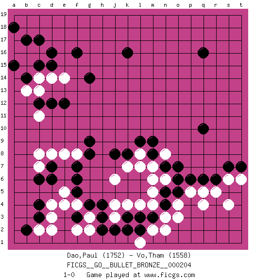 Last move : 1-0 2019 December 10 1:58:34 [Event "FICGS__GO__BULLET_BRONZE__000204"] [Site "FICGS"] [Date "2019.12.10"] [Round "1"] [Black "Dao,Paul"] [White "Vo,Tham"] [Result "1-0"] [Rating 1 "1752"] [Rating 2 "1558"] 1.q16 q4 2.d16 d4 3.r6 r5 4.q6 o4 5.q10 k4 6.k16 c14 7.c12 e14 8.f16 c16 9.c17 b16 10.d15 d14 11.b17 a17 12.a18 a16 13.c15 b15 14.b14 b13 15.a15 c13 16.c6 c8 17.c3 d3 18.c4 c2 19.b2 d2 20.d7 c7 21.d6 d8 22.f7 e8 23.f5 f4 24.g4 e5 25.f6 g3 26.f3 e4 27.h3 g2 28.h4 f2 29.m3 m4 30.n4 n3 31.n5 o3 32.l3 l4 33.k3 j3 34.j2 j4 35.h2 m2 36.l2 l1 37.k2 n2 38.o5 p5 39.p6 q5 40.g14 s6 41.s7 t6 42.t7 s4 43.g9 f8 44.g8 j6 45.k8 m6 46.n7 m7 47.m8 n6 48.o6 n8 49.o7 l8 50.m9 k7 51.l9 l7 52.j8 m5 53.e12 c11 54.d12 1-0 Here are the names of the openings (joseki) played in the four corners : Corner q4 : q4 r6 Hoshi (Hwajeom, Seongjeom, Xingwei`) 4-4 Point. The star or hoshi (4-4) point, emphasizing influence at the potential expense of territory. Ikken Kakari (Hankan Keolch'im, Yi Gua`jiao~, 1-Space Low Approach). Black 2 is the standard approach move to the 4-4. Corner d16 : d16 c14 Hoshi (Hwajeom, Seongjeom, Xingwei`) 4-4 Point. The star or hoshi (4-4) point, emphasizing influence at the potential expense of territory. Ikken Kakari (Hankan Keolch'im, Yi Gua`jiao~, 1-Space Low Approach). White 2 is the standard approach move to the 4-4. Corner d4 : d4 c6 Hoshi (Hwajeom, Seongjeom, Xingwei`) 4-4 Point. The star or hoshi (4-4) point, emphasizing influence at the potential expense of territory. Ikken Kakari (Hankan Keolch'im, Yi Gua`jiao~, 1-Space Low Approach). Black 2 is the standard approach move to the 4-4. Player Black won this Go (weiqi, baduk) game. Follow this game move after move (download)There is death in the hane. (Anonymous) They say poker is a zero-sum game. It must be, because every time I play my sum ends up zero. (Max Shapiro)
