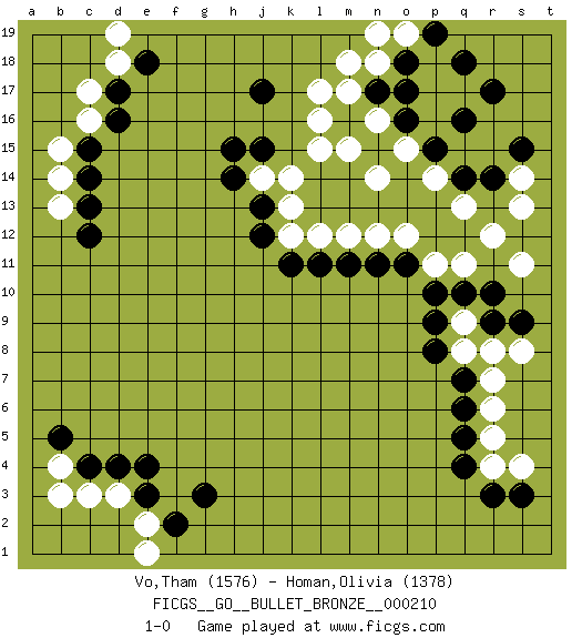 Last move : 1-0 2019 December 10 20:13:58 [Event "FICGS__GO__BULLET_BRONZE__000210"] [Site "FICGS"] [Date "2019.12.10"] [Round "1"] [Black "Vo,Tham"] [White "Homan,Olivia"] [Result "1-0"] [Rating 1 "1576"] [Rating 2 "1378"] 1.q16 p14 2.d16 c16 3.q4 r4 4.d4 d3 5.e3 c3 6.c4 b4 7.b5 b3 8.e4 e2 9.f2 e1 10.c15 c17 11.d17 b15 12.c14 b14 13.c13 b13 14.c12 d18 15.e18 d19 16.o16 l17 17.j17 l15 18.r14 n14 19.m16 l16 20.j15 m15 21.j13 n16 22.n17 m17 23.o18 n18 24.o17 m18 25.r3 r5 26.q5 r6 27.s3 s4 28.q6 r7 29.q7 r8 30.p9 p11 31.r10 r12 32.s9 s8 33.p10 q11 34.r9 q8 35.p8 q9 36.q10 s11 37.o11 o12 38.n11 n12 39.m11 m12 40.l11 l12 41.k11 k12 42.j12 k13 43.g3 j14 44.h14 k14 45.h15 o15 46.r17 s14 47.s15 s13 48.q14 q13 49.p15 o19 50.p19 n19 51.q18 1-0 Here are the names of the openings (joseki) played in the four corners : Corner q16 : q16 p14 Hoshi (Hwajeom, Seongjeom, Xingwei`) 4-4 Point. The star or hoshi (4-4) point, emphasizing influence at the potential expense of territory. Corner d16 : d16 c16 Hoshi (Hwajeom, Seongjeom, Xingwei`) 4-4 Point. The star or hoshi (4-4) point, emphasizing influence at the potential expense of territory. Corner q4 : q4 r4 Hoshi (Hwajeom, Seongjeom, Xingwei`) 4-4 Point. The star or hoshi (4-4) point, emphasizing influence at the potential expense of territory. Corner d4 : d4 d3 Hoshi (Hwajeom, Seongjeom, Xingwei`) 4-4 Point. The star or hoshi (4-4) point, emphasizing influence at the potential expense of territory. Player Black won this Go (weiqi, baduk) game. Follow this game move after move (download)Very few good moves are played. (Pierre Audouard) A government big enough to give you everything you want is strong enough to take everything you have. (Thomas Jefferson)