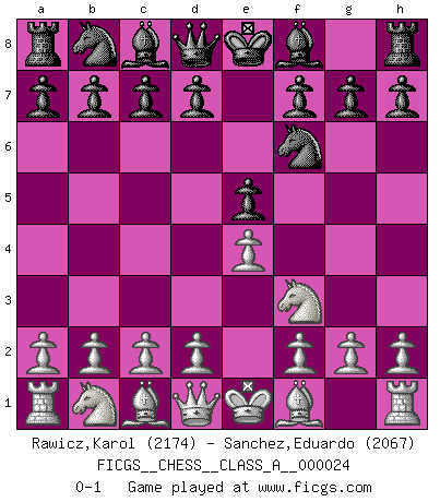 Last move : 0-1 2007 August 12 21:24:22 [Event "FICGS__CHESS__CLASS_A__000024"] [Site "FICGS"] [Date "2007.06.30"] [Round "1"] [White "Rawicz,Karol"] [Black "Sanchez,Eduardo"] [Result "0-1"] [WhiteElo "2174"] [BlackElo "2067"] 1.e4 e5 2.Nf3 Nf6 0-1 This chess game has been lost on time (started : 2007.06.30 10:16:41) Petrov's defense Player Black won this chess game. Follow this game move after move (download)War is the child of passion, passion is the child of narcissism and narcissism is the child. (...) Another game ? (Thibault de Vassal) Wenn Spassky eine Figur opfert kannst du genauso gut aufgeben. Aber wenn Tal eine Figur opfert, spiel weiter. Er könnte noch eine weitere opfern, und dann ... wer weiß? (Miguel Najdorf) Bendita sea la memoria de aquel que dio al mundo este juego inmortal. (A. G. Gardiner) Les échecs sont utiles à l'exercice de la faculté de penser et à celle de l'imagination. Car nous devons posséder une méthode élaborée pour atteindre des buts partout où nous devons conduire notre raison. (Leibnitz) There are more things in heaven and earth than practically anywhere else. (Unknown)