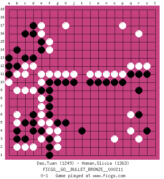 Last move : 0-1 2019 December 10 21:36:12 [Event "FICGS__GO__BULLET_BRONZE__000211"] [Site "FICGS"] [Date "2019.12.10"] [Round "1"] [Black "Dao,Tuan"] [White "Homan,Olivia"] [Result "0-1"] [Rating 1 "1249"] [Rating 2 "1363"] 1.c16 q4 2.d4 r16 3.k4 e17 4.e15 h17 5.r6 o3 6.s4 r3 7.r9 p17 8.d10 r12 9.s11 s12 10.r11 q12 11.q11 p11 12.p10 o11 13.o10 n11 14.n10 m11 15.m10 l11 16.l10 j11 17.j10 h11 18.h10 g11 19.g10 f11 20.f10 e11 21.d11 d12 22.c13 c12 23.d17 e16 24.d16 f15 25.e14 f14 26.d13 e10 27.e9 d9 28.c10 c9 29.b10 e8 30.f9 b9 31.f8 b13 32.b14 b11 33.a13 a12 34.b12 a10 35.a11 c11 36.a12 e7 37.f7 e6 38.f6 e5 39.e4 f5 40.g5 f4 41.f3 g3 42.f2 g4 43.h5 g2 44.f1 d2 45.c3 c2 46.b3 e3 47.d5 b2 48.d6 b5 49.b4 b6 50.c5 q6 0-1 Here are the names of the openings (joseki) played in the four corners : Corner d16 : c16 e17 Komoku (Somok, Xiao~mu`) 3-4 Point. The komoku (3-4) point is the traditional corner enclosure move.. Ikken Kakari (Hankan Keolch'im, Yi Gua`jiao~, 1-Space Low Pincer). The small knight move is the basic approach move to the 3-4 point stone. It has been continually used for over four centuries. There are limitless variations, with new moves constantly being discovered. White 2 opens the door to a treaure store of joseki. Corner q4 : q4 r6 Hoshi (Hwajeom, Seongjeom, Xingwei`) 4-4 Point. The star or hoshi (4-4) point, emphasizing influence at the potential expense of territory. Ikken Kakari (Hankan Keolch'im, Yi Gua`jiao~, 1-Space Low Approach). Black 2 is the standard approach move to the 4-4. Player White won this Go (weiqi, baduk) game. Follow this game move after move (download)Strange things happen at the one-two points. (Anonymous) Home computers are being called upon to perform many new functions, including the consumption of homework formerly eaten by the dog. (Doug Larson)