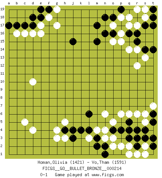 Last move : 0-1 2019 December 10 22:41:21 [Event "FICGS__GO__BULLET_BRONZE__000214"] [Site "FICGS"] [Date "2019.12.10"] [Round "1"] [Black "Homan,Olivia"] [White "Vo,Tham"] [Result "0-1"] [Rating 1 "1421"] [Rating 2 "1591"] 1.q16 d4 2.q4 d16 3.k4 o17 4.m17 o15 5.j15 q14 6.r15 r14 7.s14 s13 8.t14 r17 9.r16 q17 10.s17 s18 11.t17 r12 12.o16 p16 13.n16 p15 14.o18 p18 15.n18 r6 16.r4 p6 17.o4 h3 18.h4 g4 19.j3 h5 20.j4 g3 21.t18 s19 22.r18 q18 23.t19 r19 24.p19 g17 25.m15 d10 26.c17 c16 27.d17 e17 28.e18 f18 29.d18 e16 30.b17 b16 31.a17 c5 32.f19 g19 33.e19 m4 34.m3 l3 35.l4 n3 36.m2 n4 37.n2 o3 38.p4 o2 39.n1 n6 40.l6 q2 41.r2 s2 42.s3 r1 43.r3 s5 44.t2 s1 45.q3 p2 46.t3 q1 47.q5 q6 48.s4 o5 49.t5 s6 50.t6 t7 0-1 Here are the names of the openings (joseki) played in the four corners : Corner q16 : q16 o17 Hoshi (Hwajeom, Seongjeom, Xingwei`) 4-4 Point. The star or hoshi (4-4) point, emphasizing influence at the potential expense of territory. Ikken Kakari (Hankan Keolch'im, Yi Gua`jiao~, 1-Space Low Approach). White 2 is the standard approach move to the 4-4. Corner d16 : d16 j15 Hoshi (Hwajeom, Seongjeom, Xingwei`) 4-4 Point. The star or hoshi (4-4) point, emphasizing influence at the potential expense of territory. Corner q4 : q4 r6 Hoshi (Hwajeom, Seongjeom, Xingwei`) 4-4 Point. The star or hoshi (4-4) point, emphasizing influence at the potential expense of territory. Ikken Kakari (Hankan Keolch'im, Yi Gua`jiao~, 1-Space Low Approach). White 2 is the standard approach move to the 4-4. Player White won this Go (weiqi, baduk) game. Follow this game move after move (download)Never try to cut bamboo joints. (Anonymous) I take risks, sometimes patients die, but not taking risks causes more patients to die. So I guess my biggest problem is I've been cursed with the ability to do the math. (Gregory House, House M.D.)