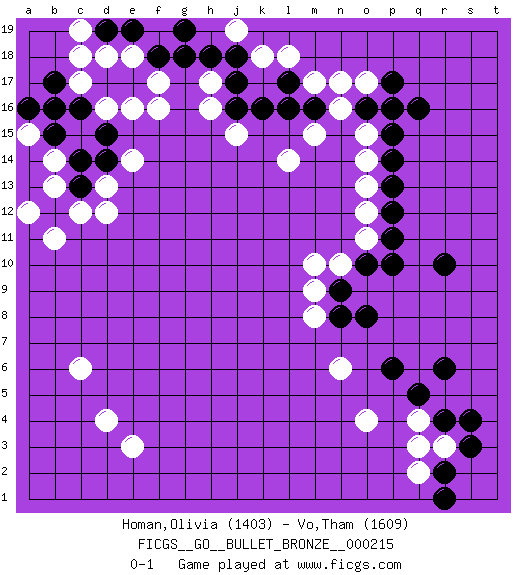 Last move : 0-1 2019 December 10 22:59:5 [Event "FICGS__GO__BULLET_BRONZE__000215"] [Site "FICGS"] [Date "2019.12.10"] [Round "1"] [Black "Homan,Olivia"] [White "Vo,Tham"] [Result "0-1"] [Rating 1 "1403"] [Rating 2 "1609"] 1.q16 d4 2.c16 q4 3.r10 o17 4.m16 o15 5.p15 o14 6.p14 o13 7.p13 o12 8.p12 o11 9.r6 o4 10.s4 r3 11.p6 e16 12.e17 f17 13.d17 f16 14.j17 c15 15.b15 d16 16.c14 c17 17.b16 c18 18.d15 j15 19.k16 l14 20.o16 n16 21.p16 n17 22.p17 m17 23.l17 m15 24.l16 k18 25.j18 l18 26.f18 e18 27.g18 h16 28.j16 h17 29.h18 f19 30.g19 j19 31.e19 d18 32.d19 c19 33.b17 c6 34.p10 e3 35.p11 n6 36.o8 m8 37.n8 m9 38.o10 n10 39.n9 m10 40.r4 q3 41.q5 c12 42.s3 d13 43.r2 q2 44.r1 b13 45.c13 d12 46.d14 b14 47.b12 b11 48.a14 a12 49.a13 a15 50.a16 e14 0-1 Here are the names of the openings (joseki) played in the four corners : Corner q16 : q16 o17 Hoshi (Hwajeom, Seongjeom, Xingwei`) 4-4 Point. The star or hoshi (4-4) point, emphasizing influence at the potential expense of territory. Ikken Kakari (Hankan Keolch'im, Yi Gua`jiao~, 1-Space Low Approach). White 2 is the standard approach move to the 4-4. Corner q4 : q4 r6 Hoshi (Hwajeom, Seongjeom, Xingwei`) 4-4 Point. The star or hoshi (4-4) point, emphasizing influence at the potential expense of territory. Ikken Kakari (Hankan Keolch'im, Yi Gua`jiao~, 1-Space Low Approach). Black 2 is the standard approach move to the 4-4. Corner d16 : c16 e16 Komoku (Somok, Xiao~mu`) 3-4 Point. The komoku (3-4) point is the traditional corner enclosure move.. Ikken Takagakari (Hankan Nop'dakeolch'im, Yi Gaogua`jiao~, 1-Space High Approach). The 5-4 approach move has become more popular in modern times, as modern Go emphasizes speed and influence. Player White won this Go (weiqi, baduk) game. Follow this game move after move (download)On the second line six die, eight live. (Anonymous) The project of the man are lower than those of the sky. (Chinese proverb)